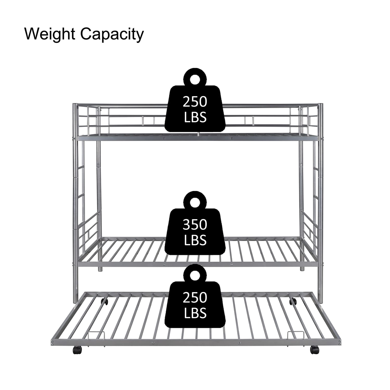 - Heavy Duty Bunk Bed :This twin size metal bunk bed frame is made of heavy duty steel ,which provides sturdiness and durability.250 lbs of upper bed ,400 lbs of bottom bed,250 lbs of twin size trundle bed