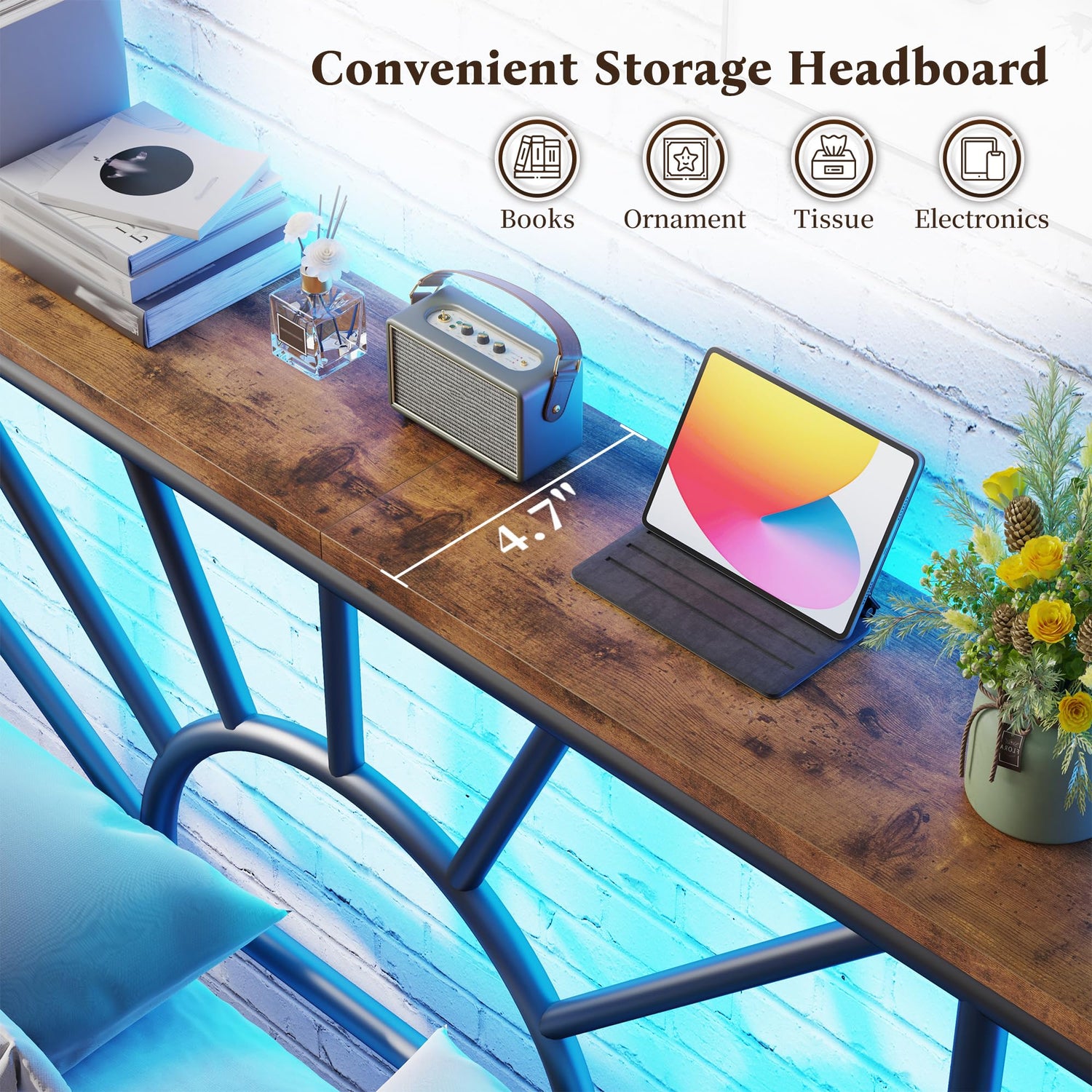 - 【Easy-Reach Headboard Storage Shelf】This metal bed frame features a headboard storage shelf, suited for keeping essentials like books, phones, and glasses within easy reach. When you lie on this mattress foundation, you can effortlessly access your belongings without needing additional storage furniture.