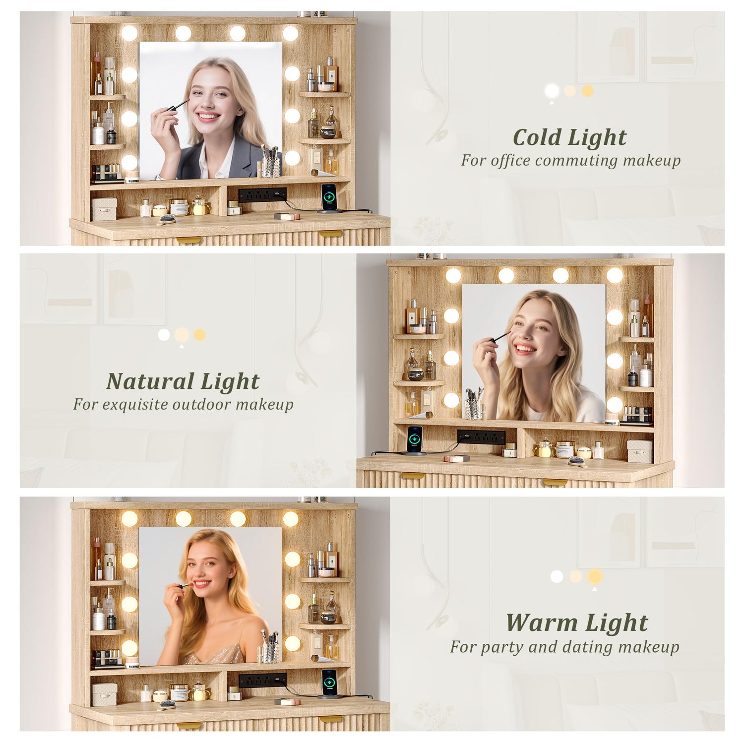 - 【3-Color Adjustable Lighting】The mirror on the small makeup vanity features three color temperature modes—cool light, natural light, and warm light—corresponding to different scenarios in your daily life such as office work, outdoor activities, and social gatherings. The high-definition mirror ensures a clear and accurate reflection, combined with adjustable brightness to eliminate any factors that could compromise makeup precision. This allows you to achieve a flawless look in any setting. Completely suitable for both home use and professional makeup studios.