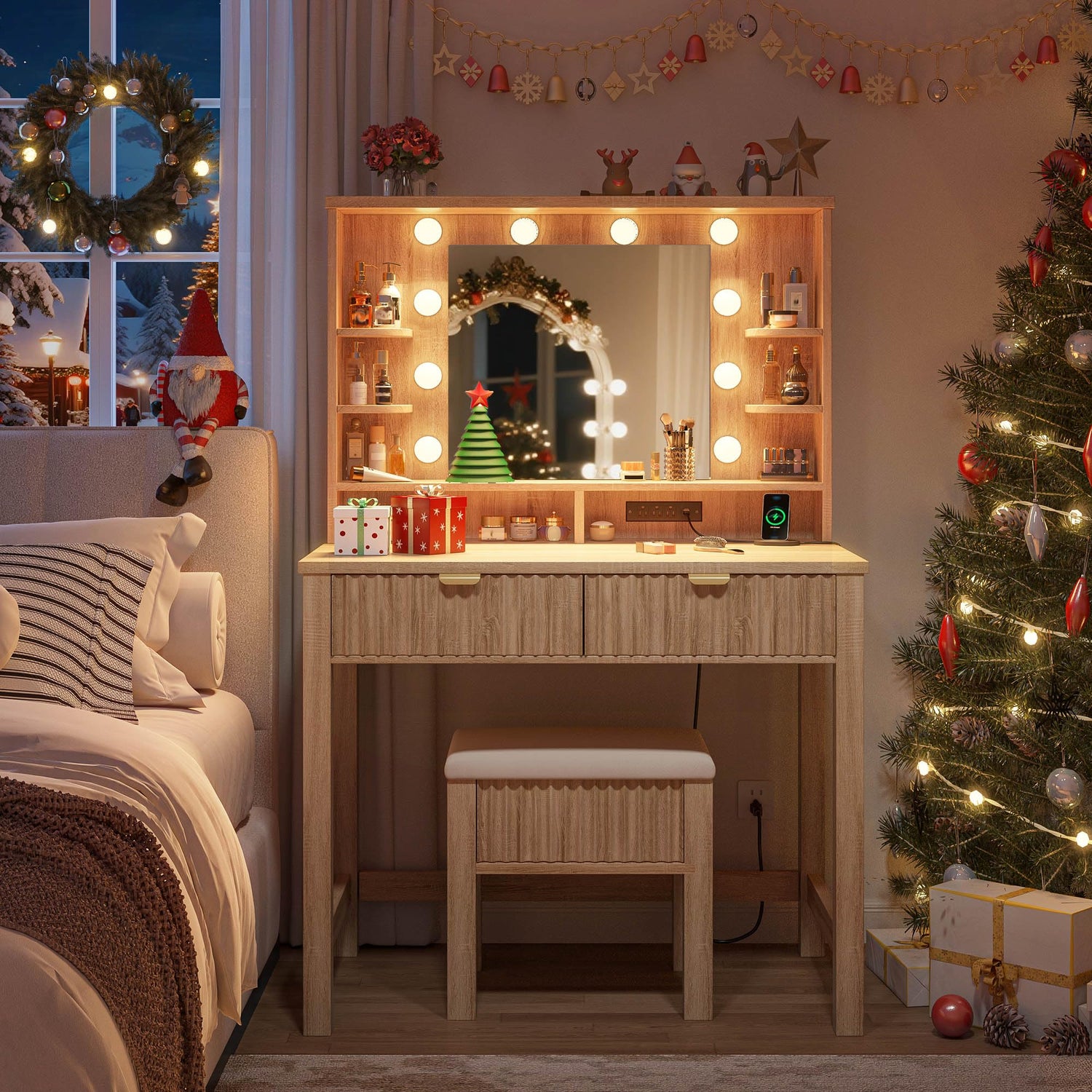 - 【Built-in Charging Station】Designed for convenience, the small vanity desk with mirror and lights includes a built-in charging station, allowing you to power your curling iron, hair dryer, beauty devices, as well as charge your phone or tablet. Never worry about low battery—stay connected while you get ready.