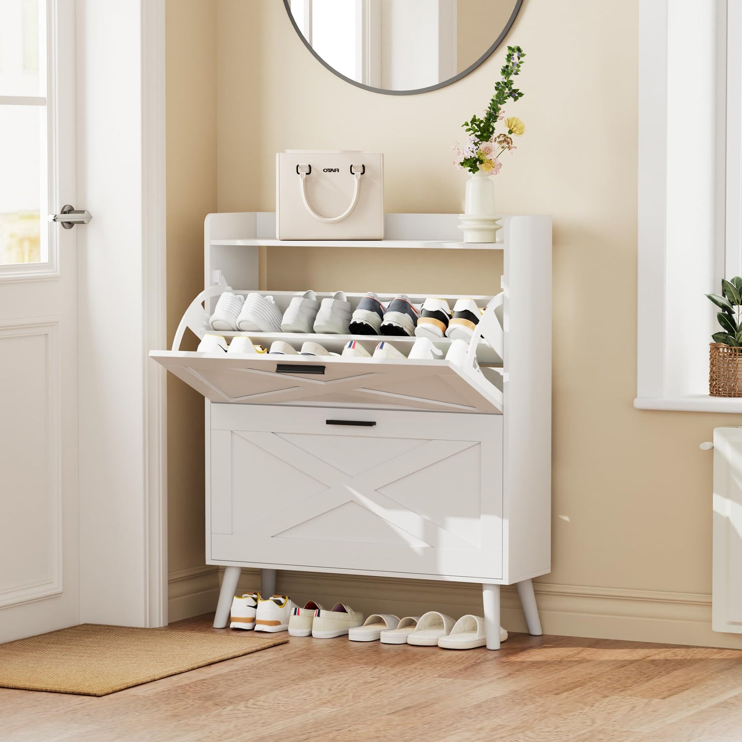 Homleke Farmhouse Shoe Storage Cabinet with 2 Flip Drawers and Barn Door Design, Adjustable Shelves, Modern Hidden Slim Narrow Shoe Rack Cabinet for Entryway, Foyer, Hallway, Living Room, White
