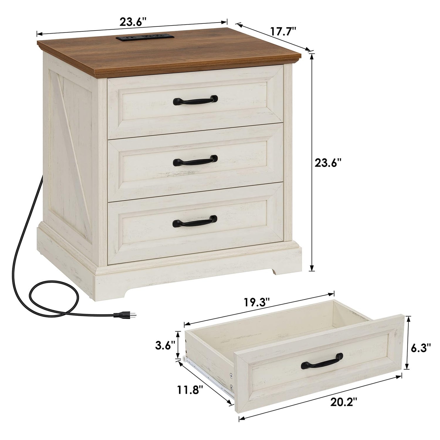 HOMMPA 24'' Farmhouse Nightstand with Charging Station, Bedside Tables with Storage, Side Table with USB Port, 3 Drawers End Table Dresser, Wood Night Stand for Bedroom, Living Room, Rustic White
