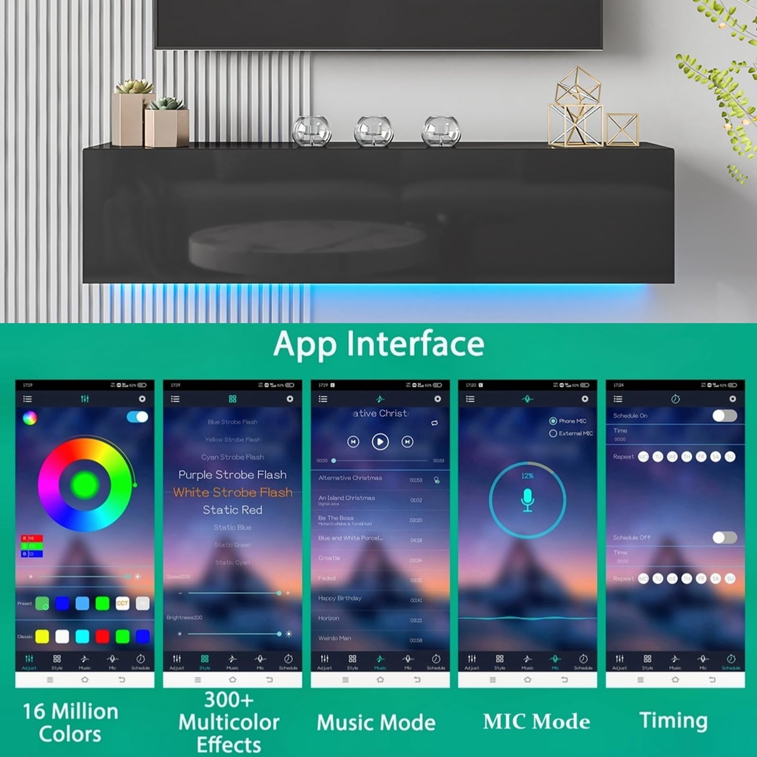 - Immersive LED Lighting: Elevate your entertainment experience with our minimalist wall-mounted TV stand featuring multi-color ambilight LED lighting. Control the ambiance with ease using the APP or remote control, offering 29 dynamic styles and over 6,000,000 color options. Transform your room's atmosphere effortlessly from the comfort of your couch.