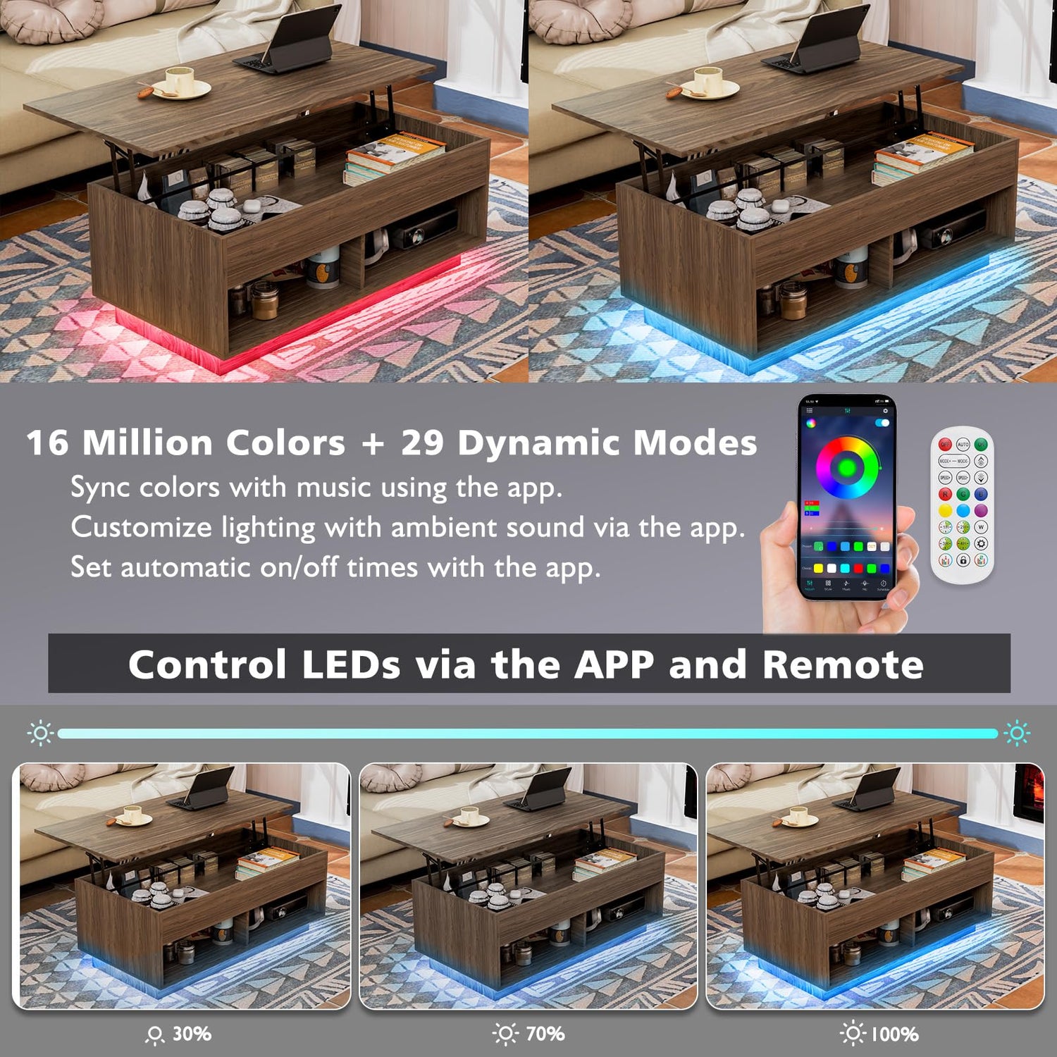 - Smart LED Light: Adjust 60,000+ colors, brightness, timer and multiple modes of the modern coffee table set & TV cabinet simultaneously via App and remote control to create an energetic atmosphere
