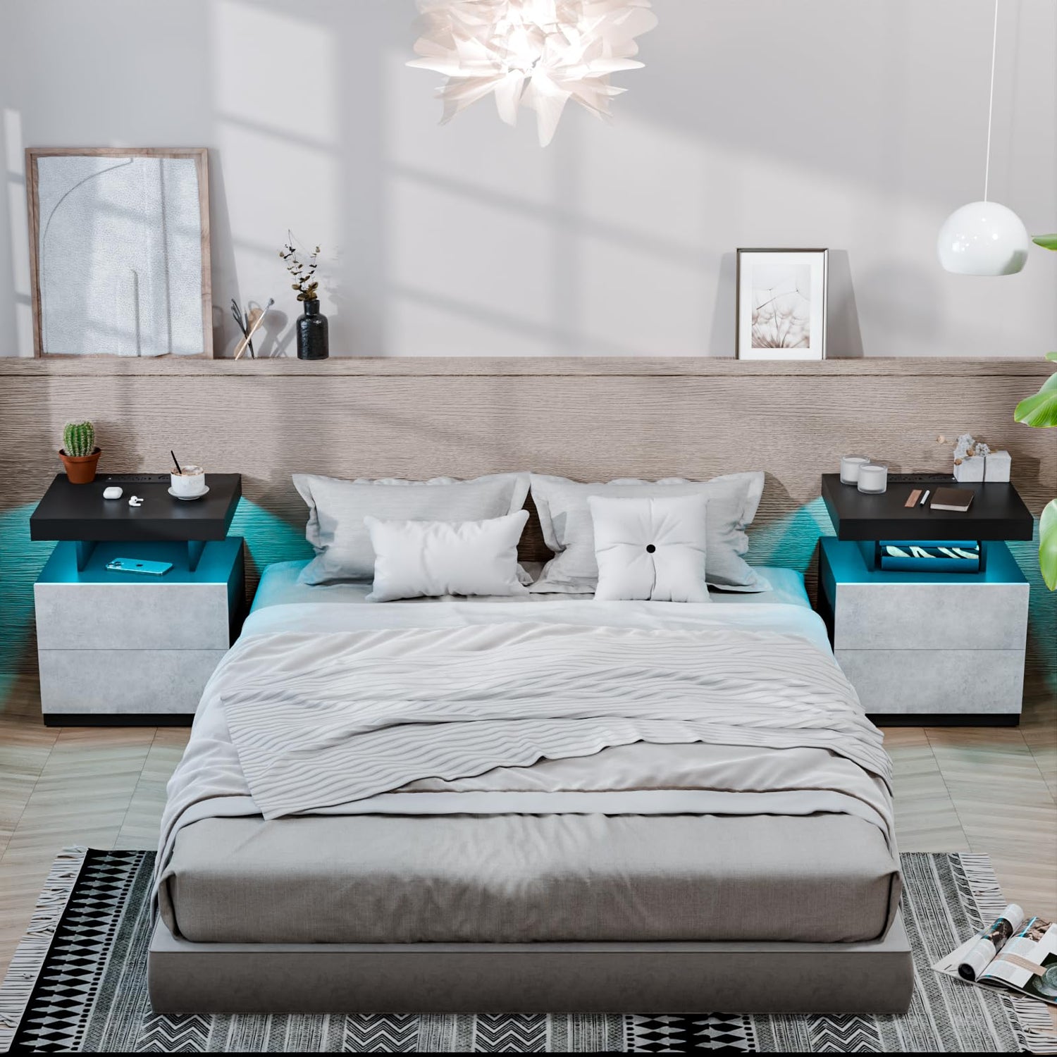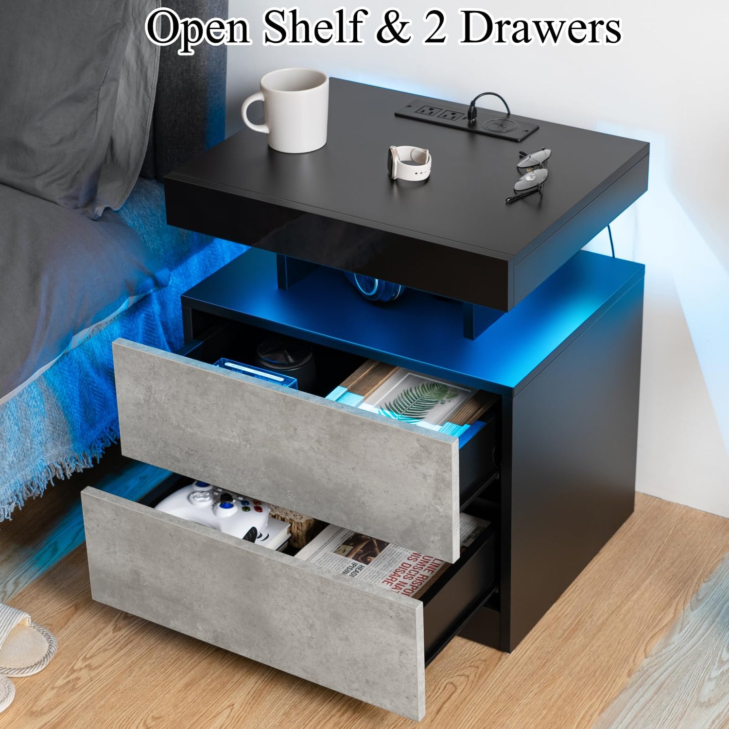 HOMMPA LED Nightstand with Wireless Charging Station & USB Ports High Gloss Bedside Table with LED Light RGB Adjustable Brightness Smart Nightstand 2 Drawers Night Stand for Bedroom Grey