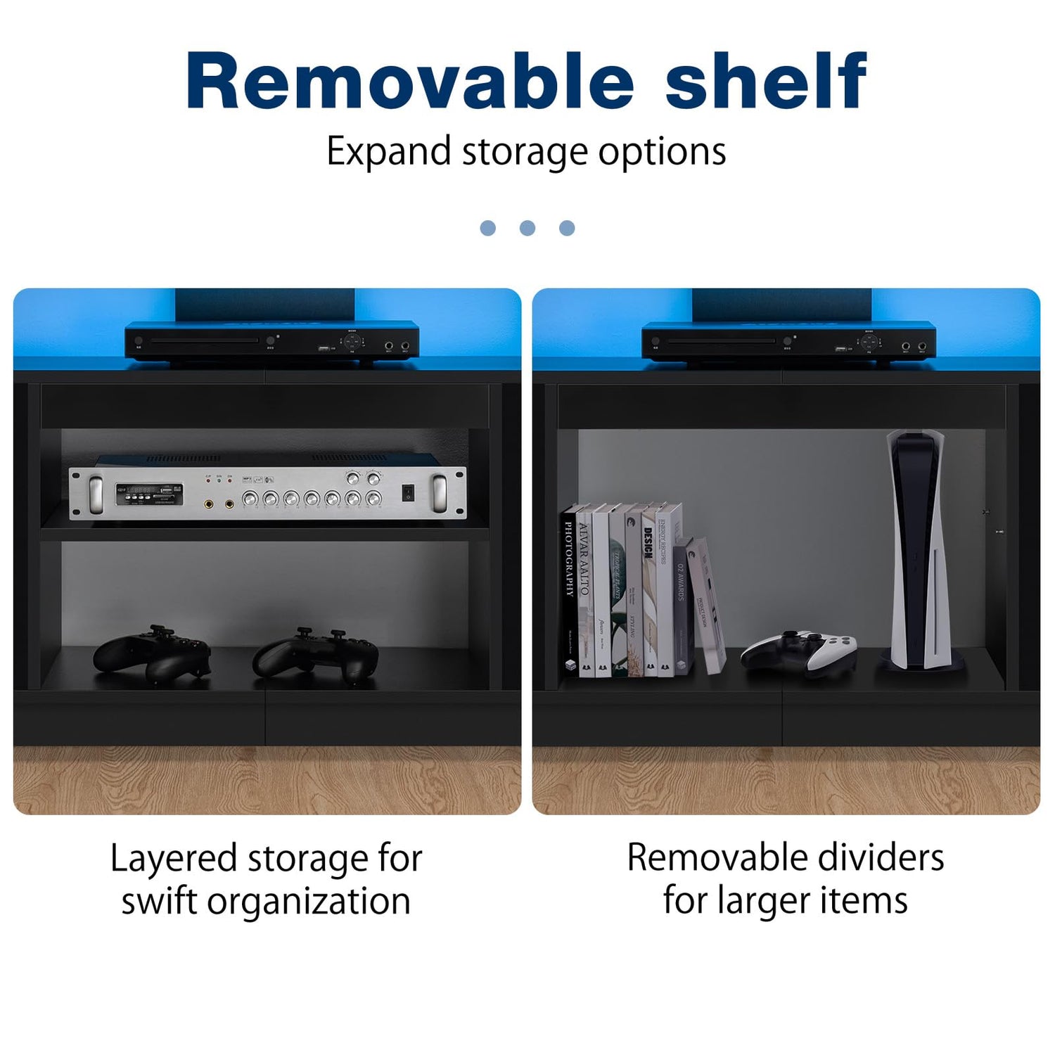 - 【Spacious Storage Space】Offers 5 open shelves and 2 large cabinets. Store DVDs, CDs, gaming devices, books, etc. The removable middle shelf allows customization, excellent for your PS5 and gaming gear. The back wire holes also help you organize wires and cables to ensure a neat and clean line of sight.