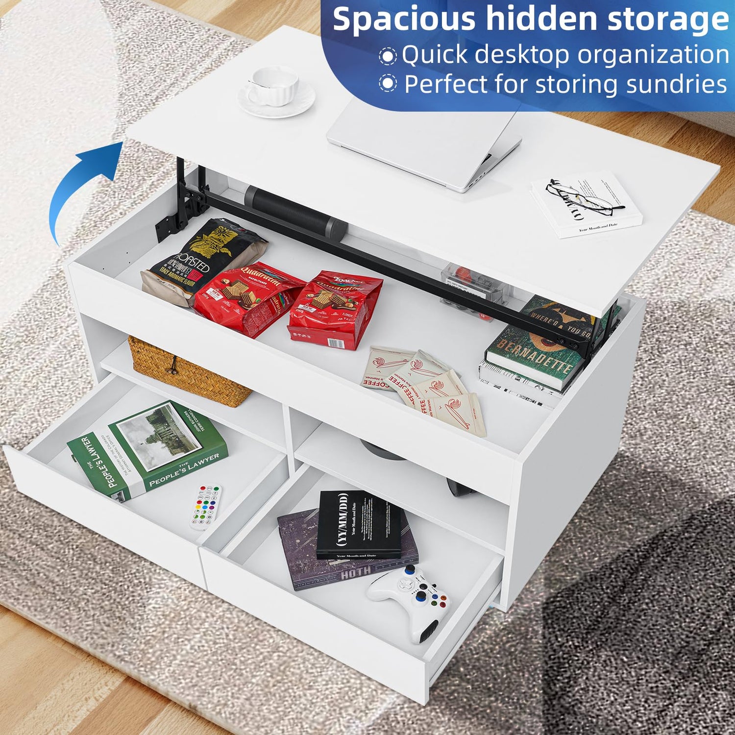 - White Coffee Table with Storage: A large table top excellent for displaying essentials and can also be used for various home office tasks. Elevating its functionality is a roomy hidden compartment, 2 open shelves and 2 drawers, making it the excellent storage solution for everyday use.