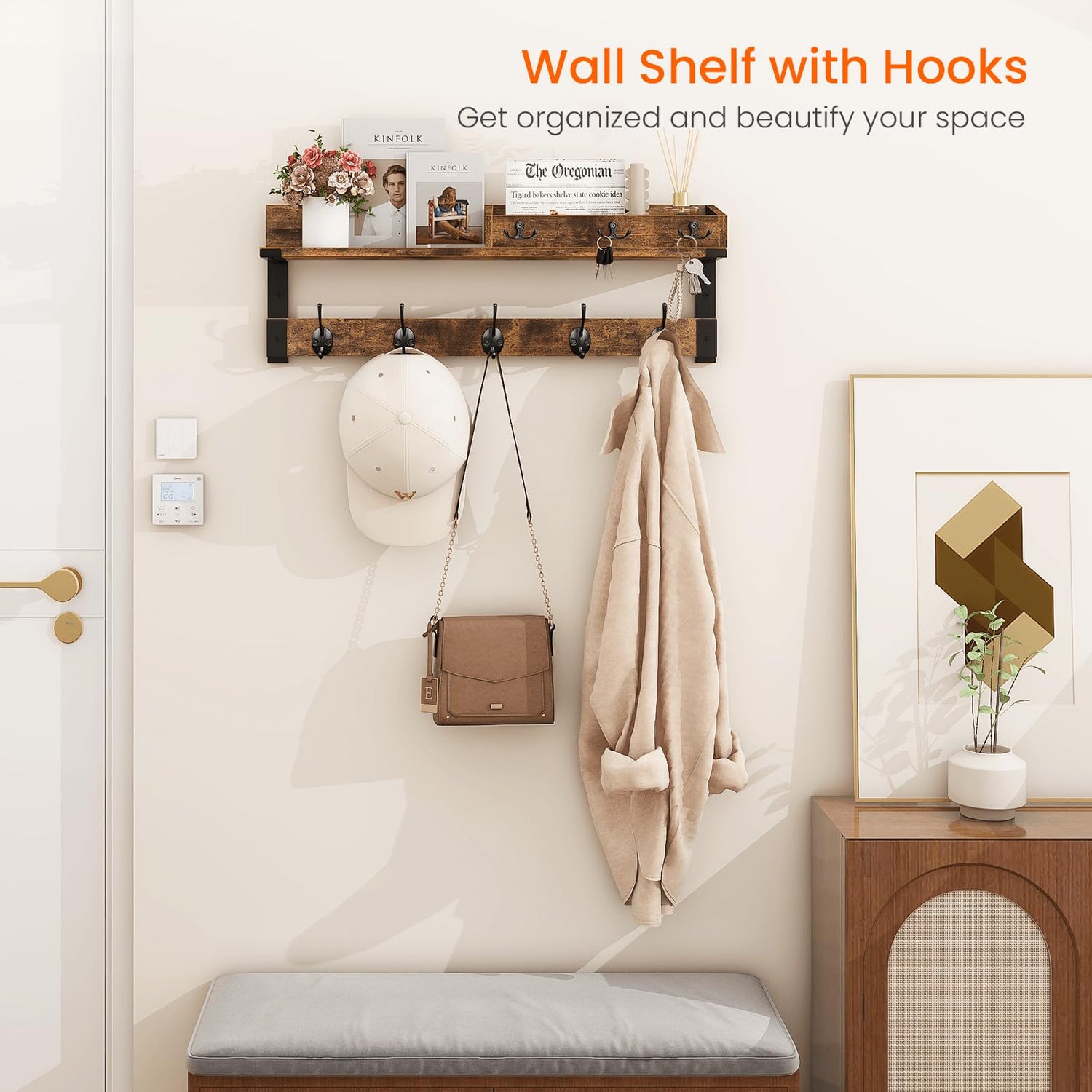 Homode Coat Rack with Shelf, Wall Shelf with Hooks, 26 Inch Long Coat Hanger Wall Mount with Key and Mail Holder, Wood Entryway Shelves for Hanging Hat Jacket Backpack Purse, Rustic Brown Black