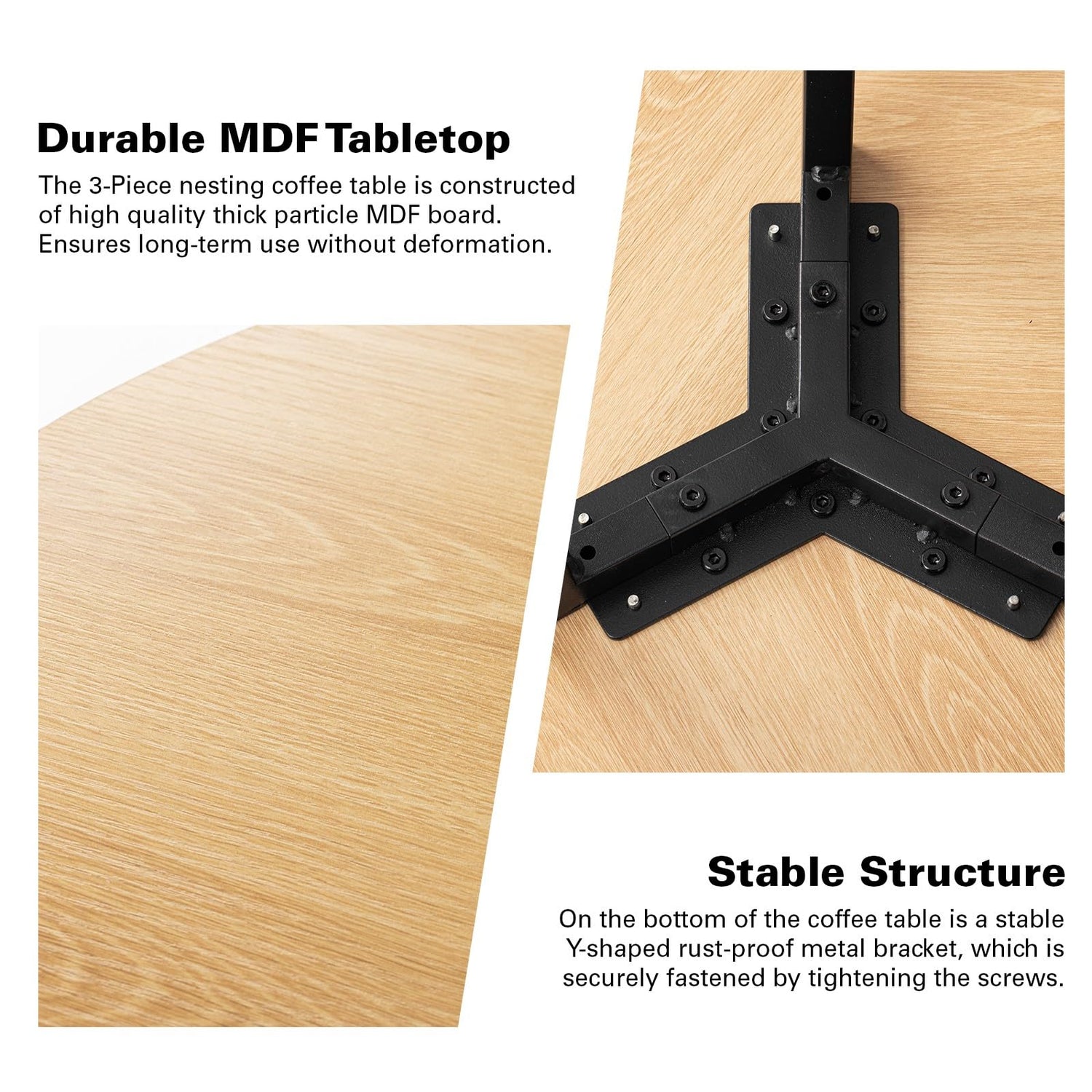 - [Stable & Durable Living Room Tables] The desktop of nesting coffee table is made of high-quality MDF density board, which ensures long-term use without deformation, and is waterproof, scratch-proof and collision-proof, which can perfectly resist daily wear and tear. MDF is more environmentally friendly than wood.
