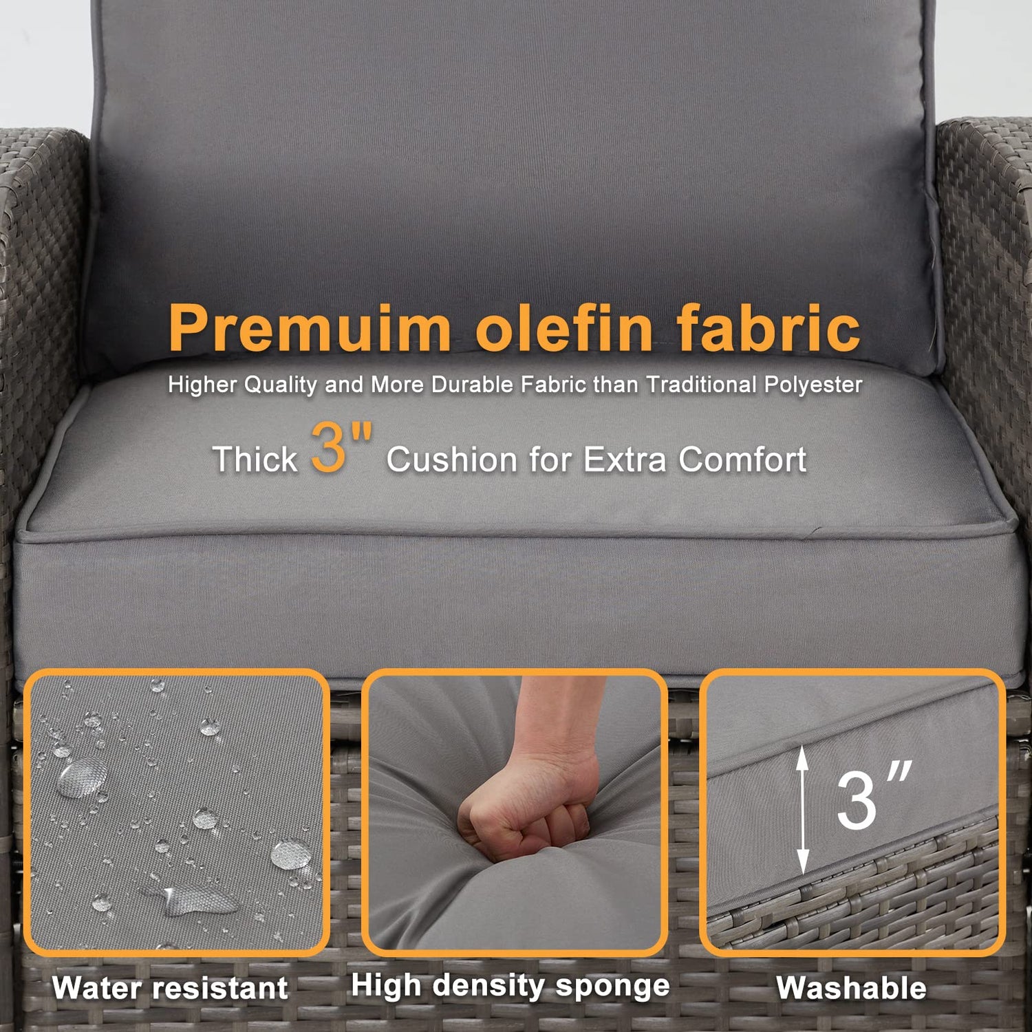 - WATERPROOF & WASHABLE & COMFORT - The cover of the cushion is water repellent and dirty-proof. We designed each cushion with a inside zipper for easy remove and better look. The thickness of the cushion is 3", soft and cozy, such thickness is mainly to provide you with more comfortable feeling when sitting and leaning.