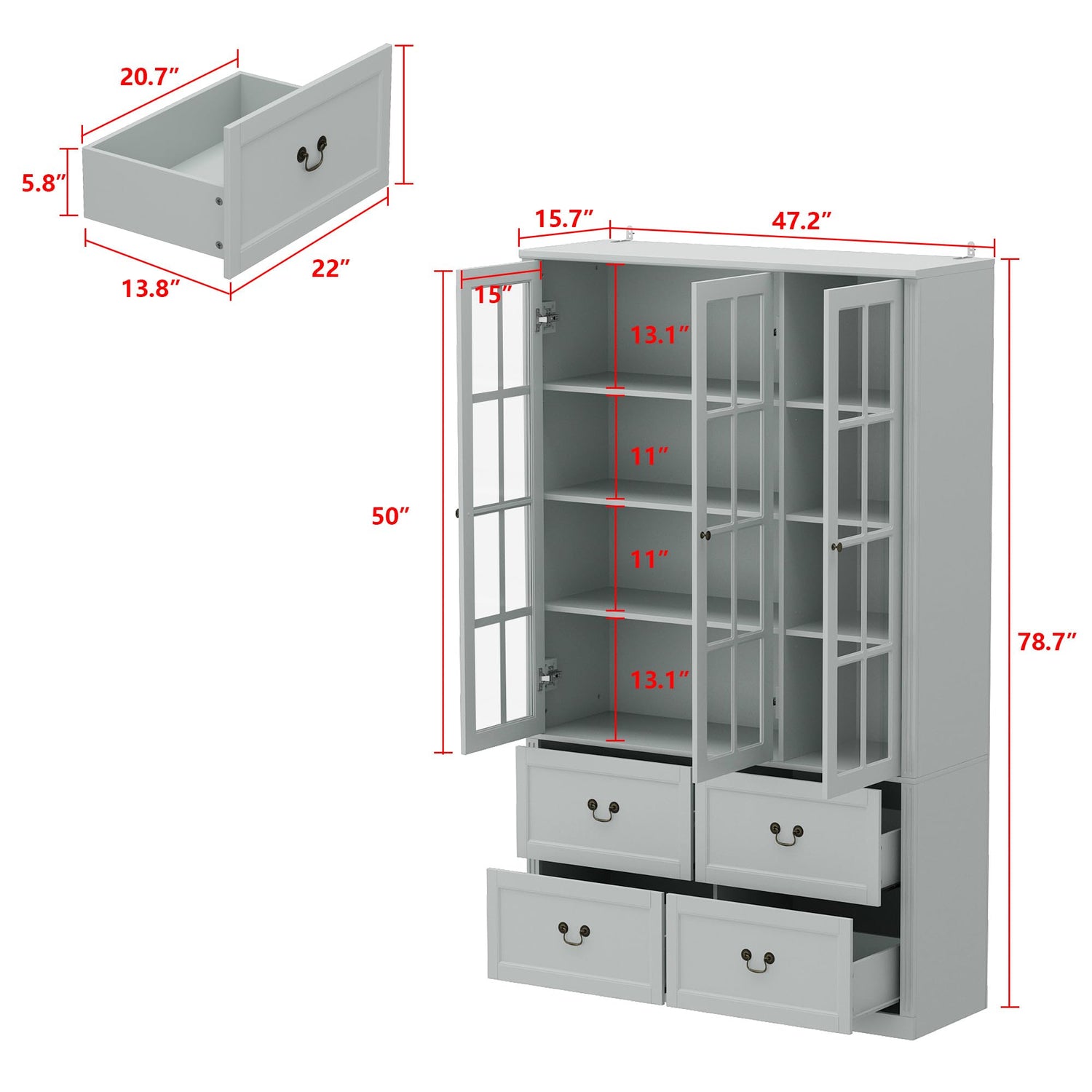 Details: This tall bookcase with 3 framed glass doors is modern style, it uses solid black boards to match with stylish bronze handles to show elegant charm. It matches well with various decors. It features total 8 storage shelves and 4 drawers. The top shelves behind the glass doors are perfect for display crafts and store books, with these doors, this cabinet will keep your stuffs away from dust, the sliders on the drawers can help to keep items in place. Overall dimensions: 47.2”W x 15.7”D x 78.7”H.