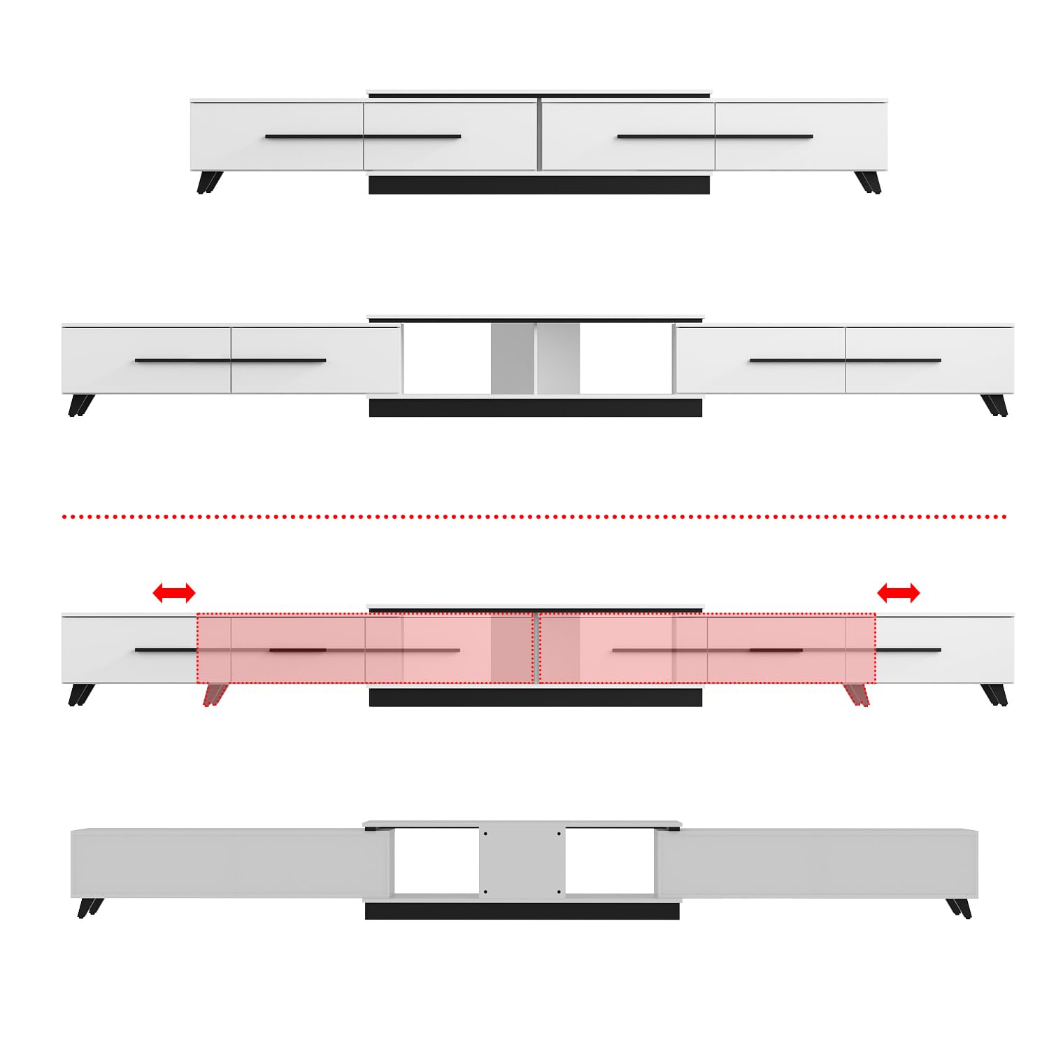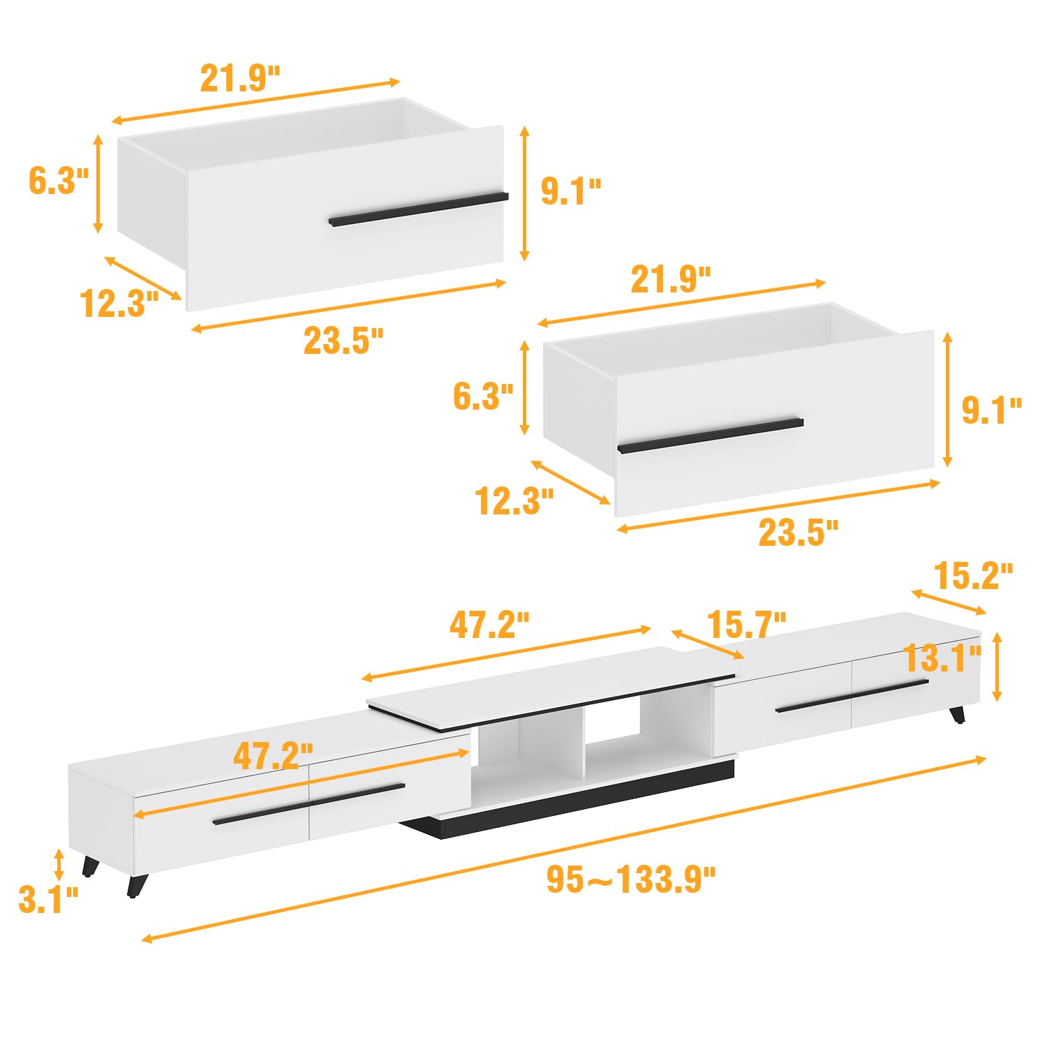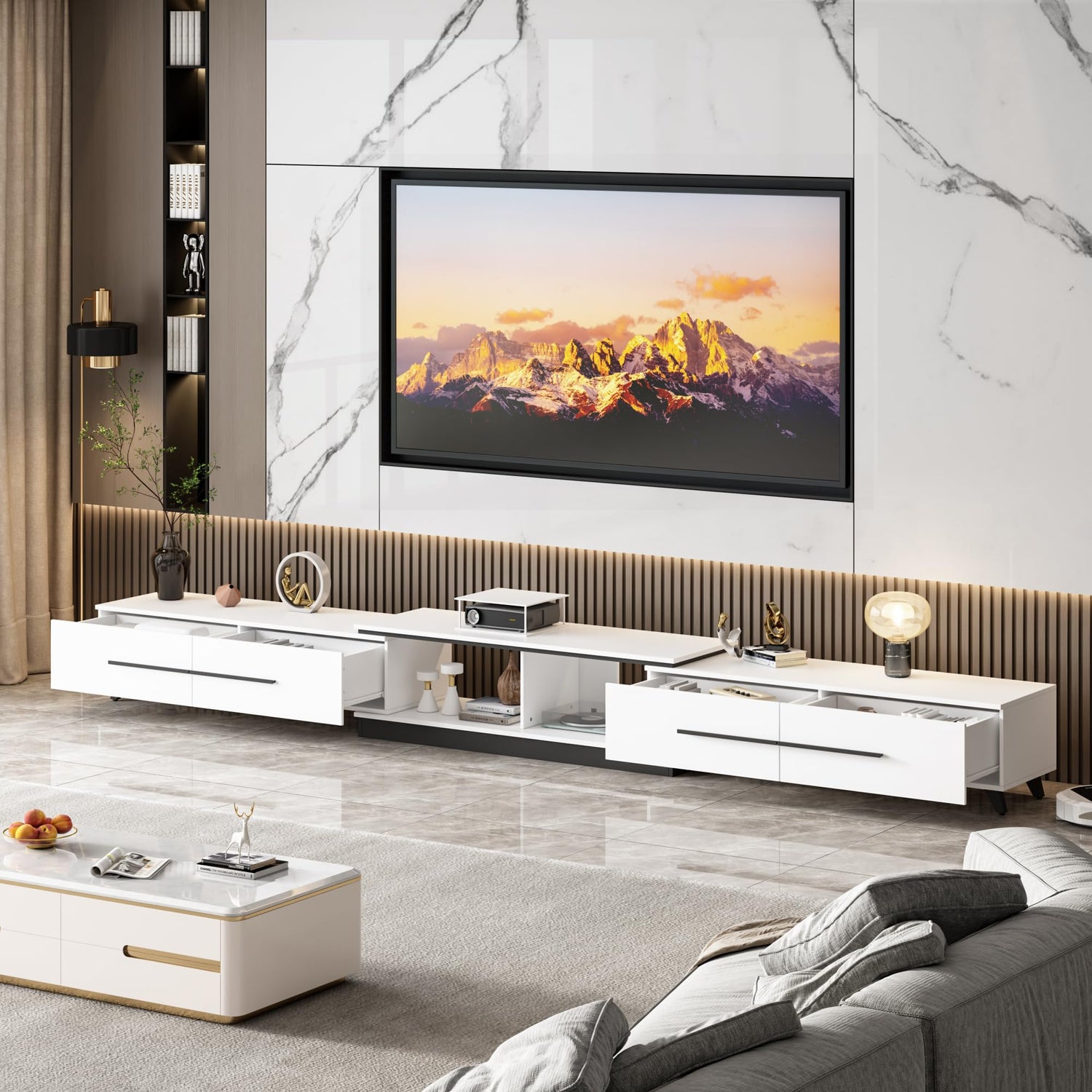 - [Ample Storage Space]: This white TV stand features spacious tabletop, 2 open compartments after extending and 4 drawers. There is sufficient space for TV, cable box, DVD, CDs, plants, decorative crafts and so on