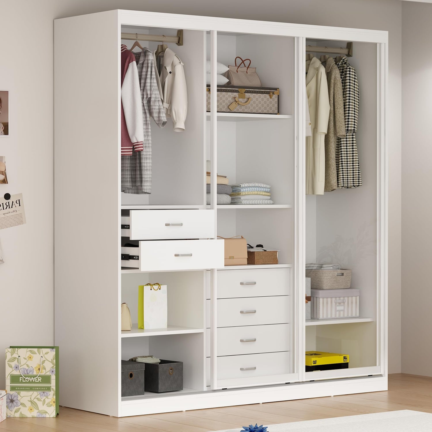 Homsee Extra Large White & Silver Sliding Glass Door Wardrobe Armoire with 2 Hanging Bars and 6 Drawers