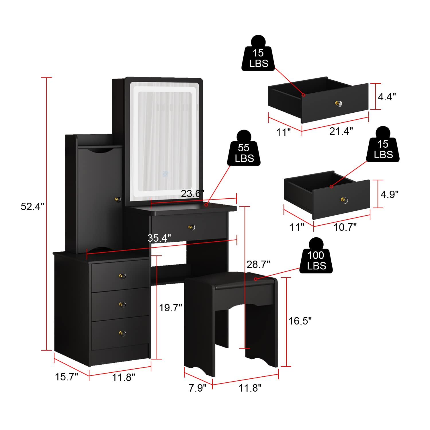- [Dimensions & Assembly]: Overall sizes: 33”L x 15.7”W x 52.4”H. This black vanity desk and stool set is assembly required, all parts and instructions are included in package. You can look through the manual first then follow the steps