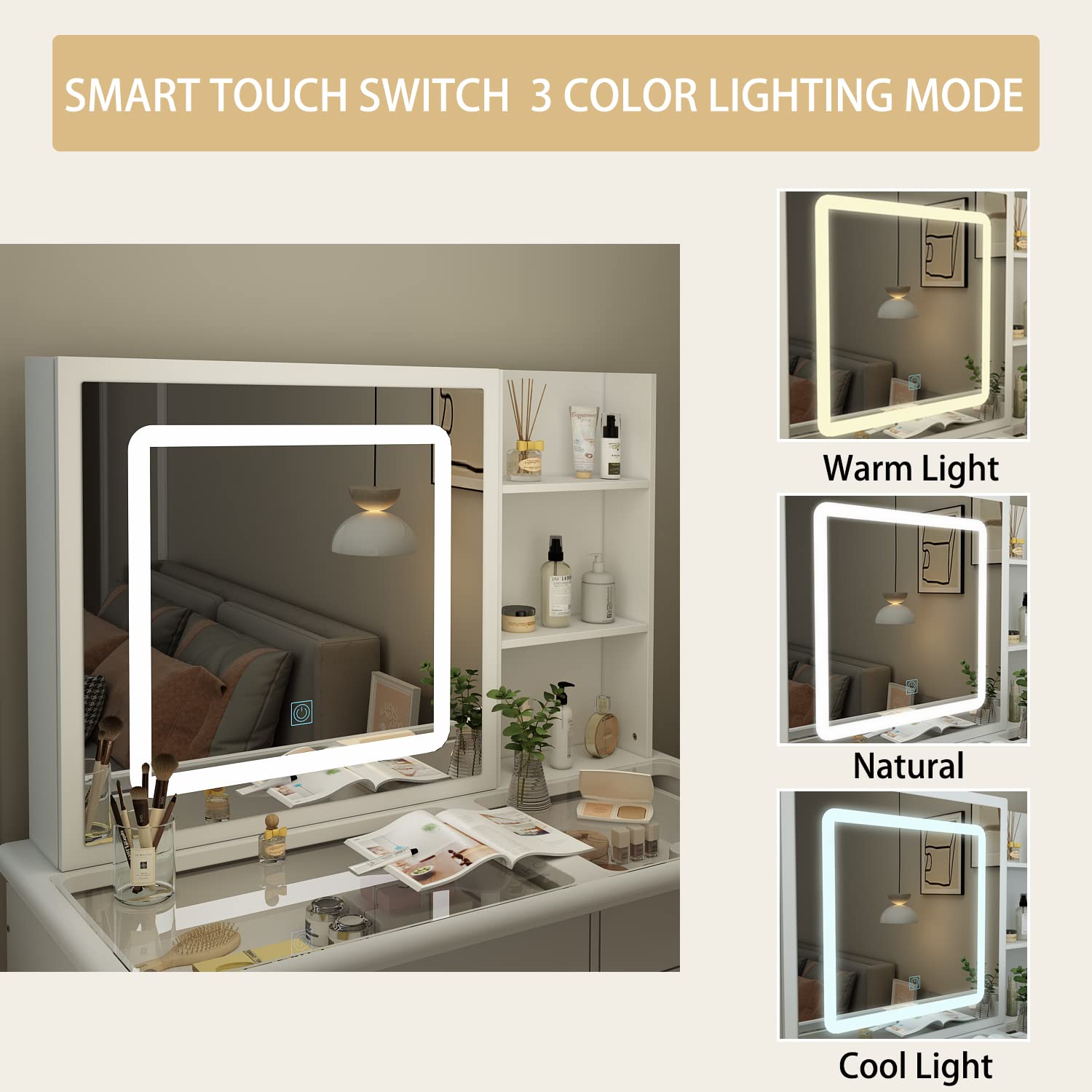 - [3 Colors LED Light]: This white vanity desk set features an intelligent touch LED mirror, the brightness will change gradually when you are long pressing the button. Besides, there are 3 colors of light can be switched, the mirror can be sliding. It’s easy to do makeup with the lighted mirror