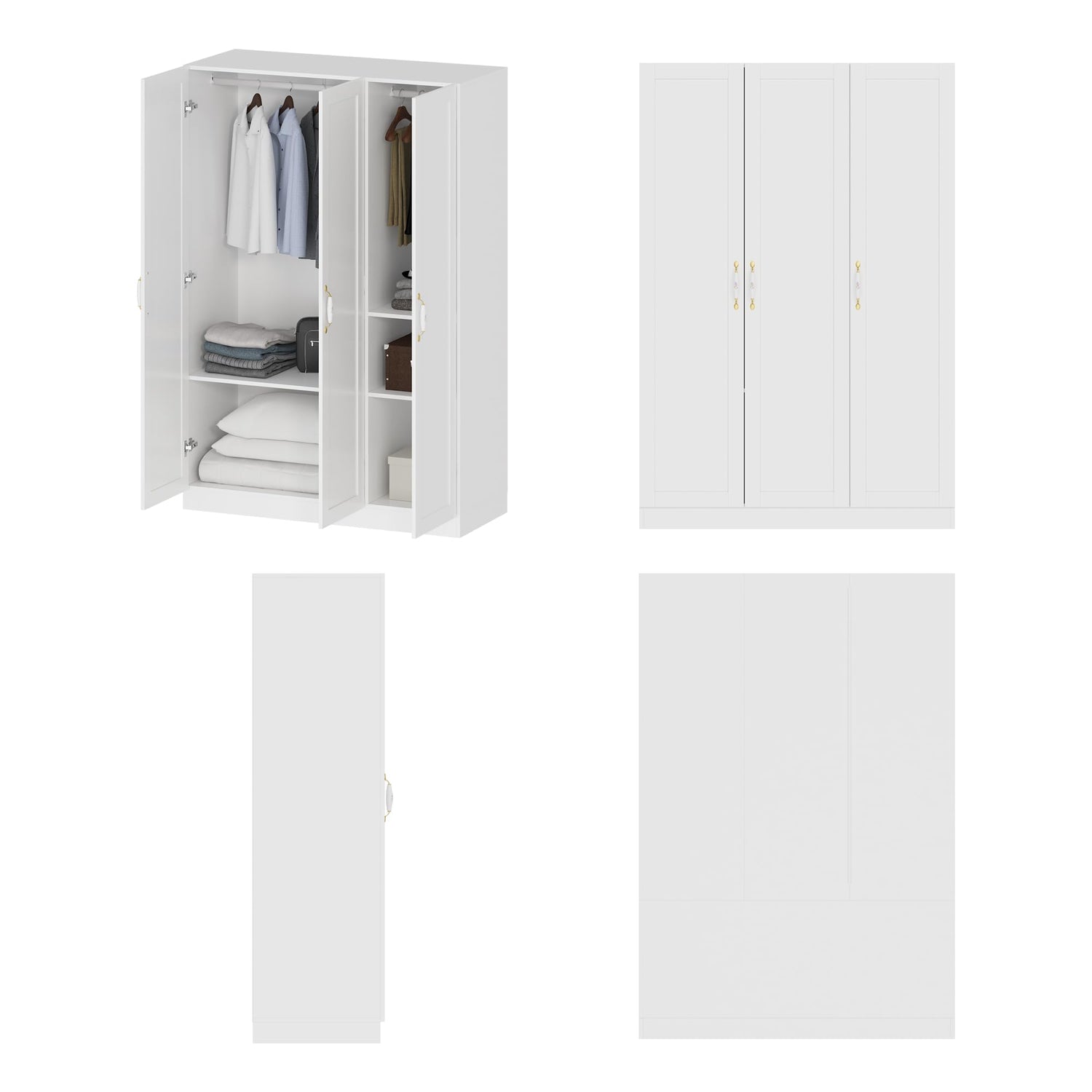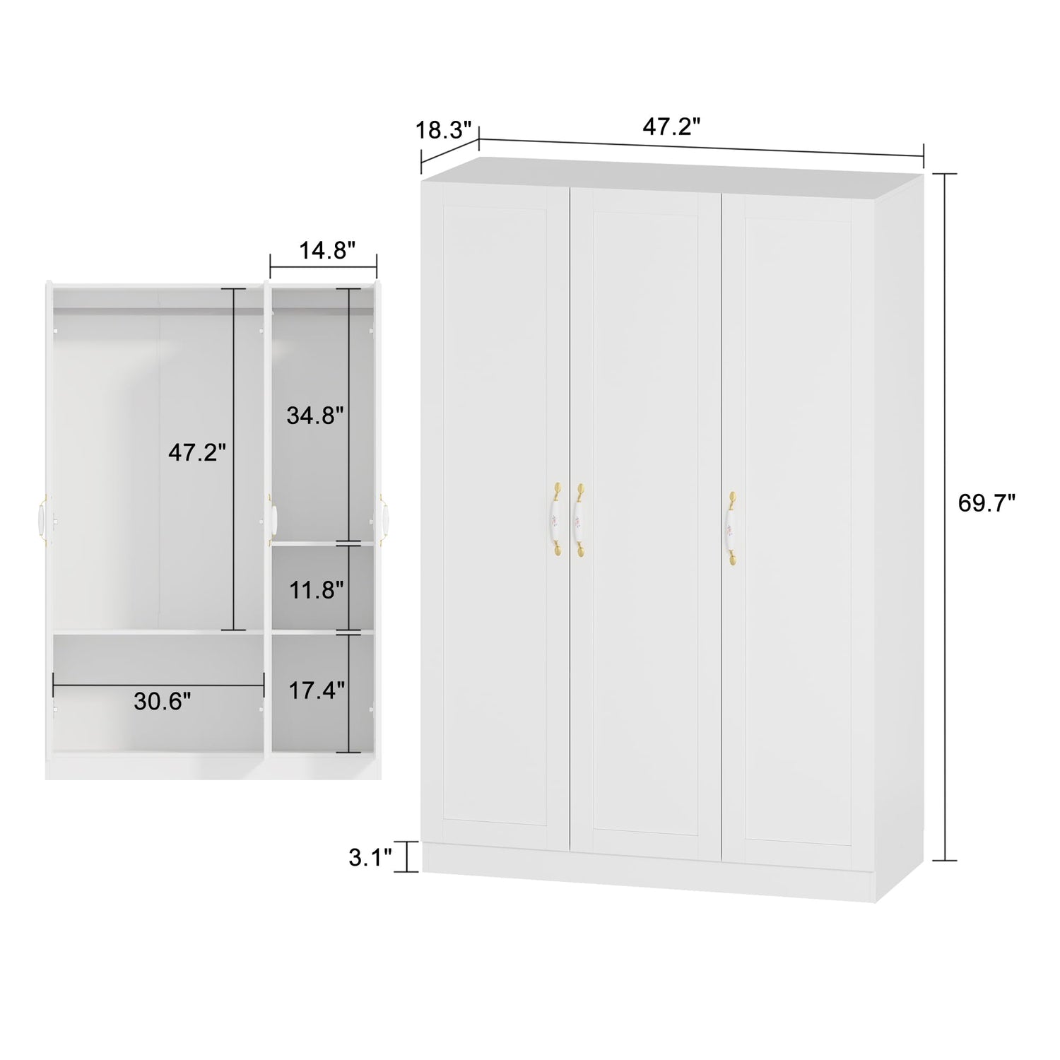 Homsee 3-door bedroom wardrobe with hanging rods is simple and elegant, it uses white boards and gold handles with flower pattern to show modern charm.This large wardrobe matches well with various house decors. It is suitable for many occasions, you can pace it in kids or adult bedroom, fitting room, living room, office, school, hospital, etc. Overall Sizes: 47.2”L x 18.3”W x 69.7”H.
