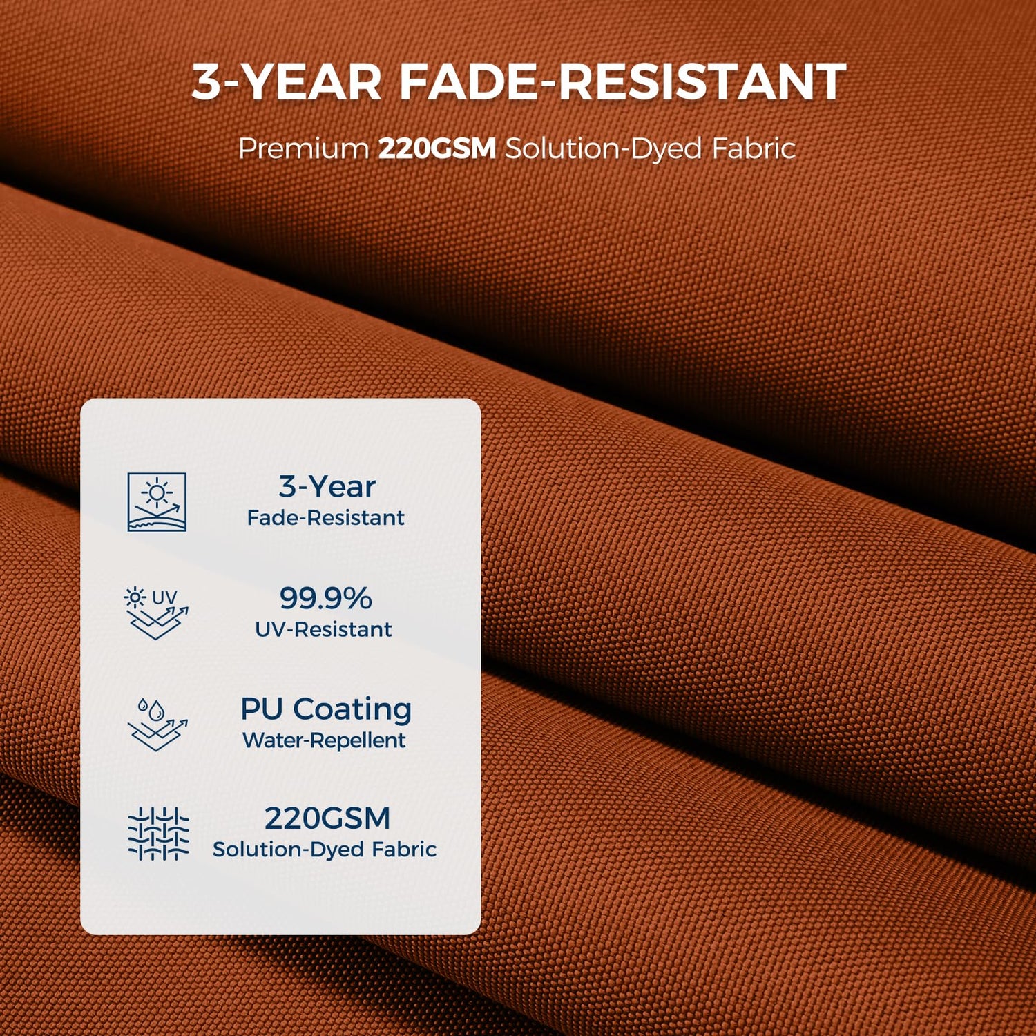- PREMIUM CANOPY: Made of high-quality 220gsm solution-dyed fabric with UPF50+ anti-UV coating provides 3-year fade-resistant, 99.9% UV-resistant, and water-repellant properties. Effectively blocks harmful UV rays including UVA and UVB to protect your health.