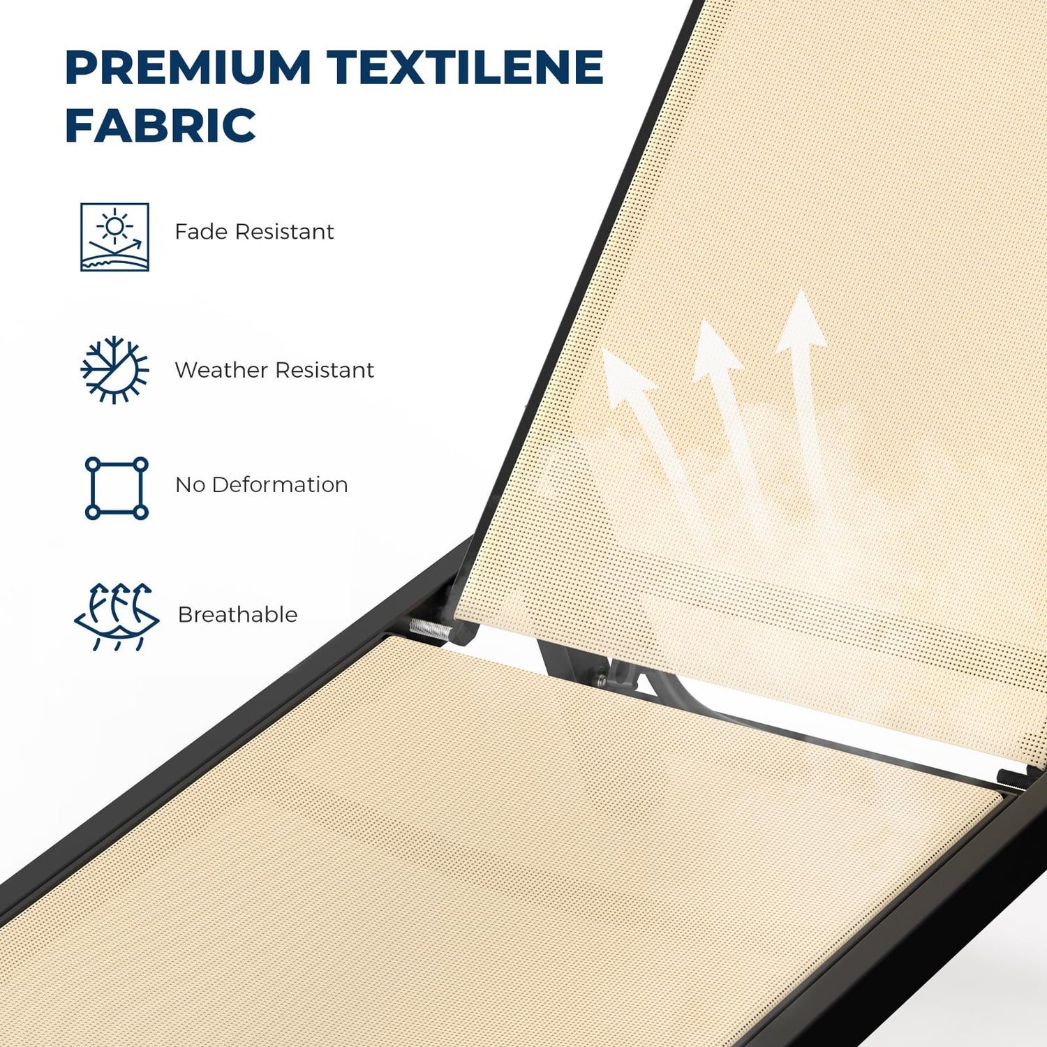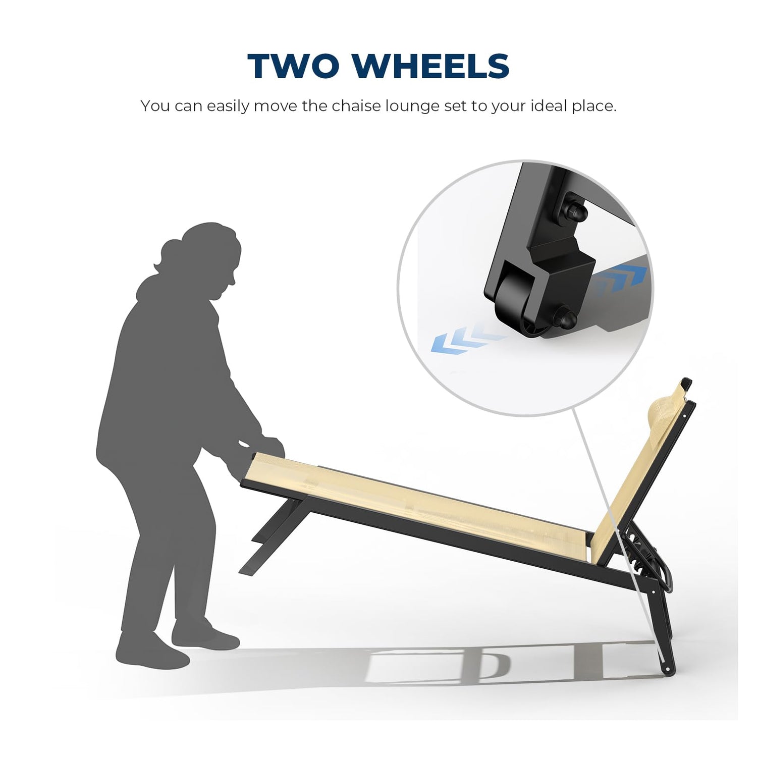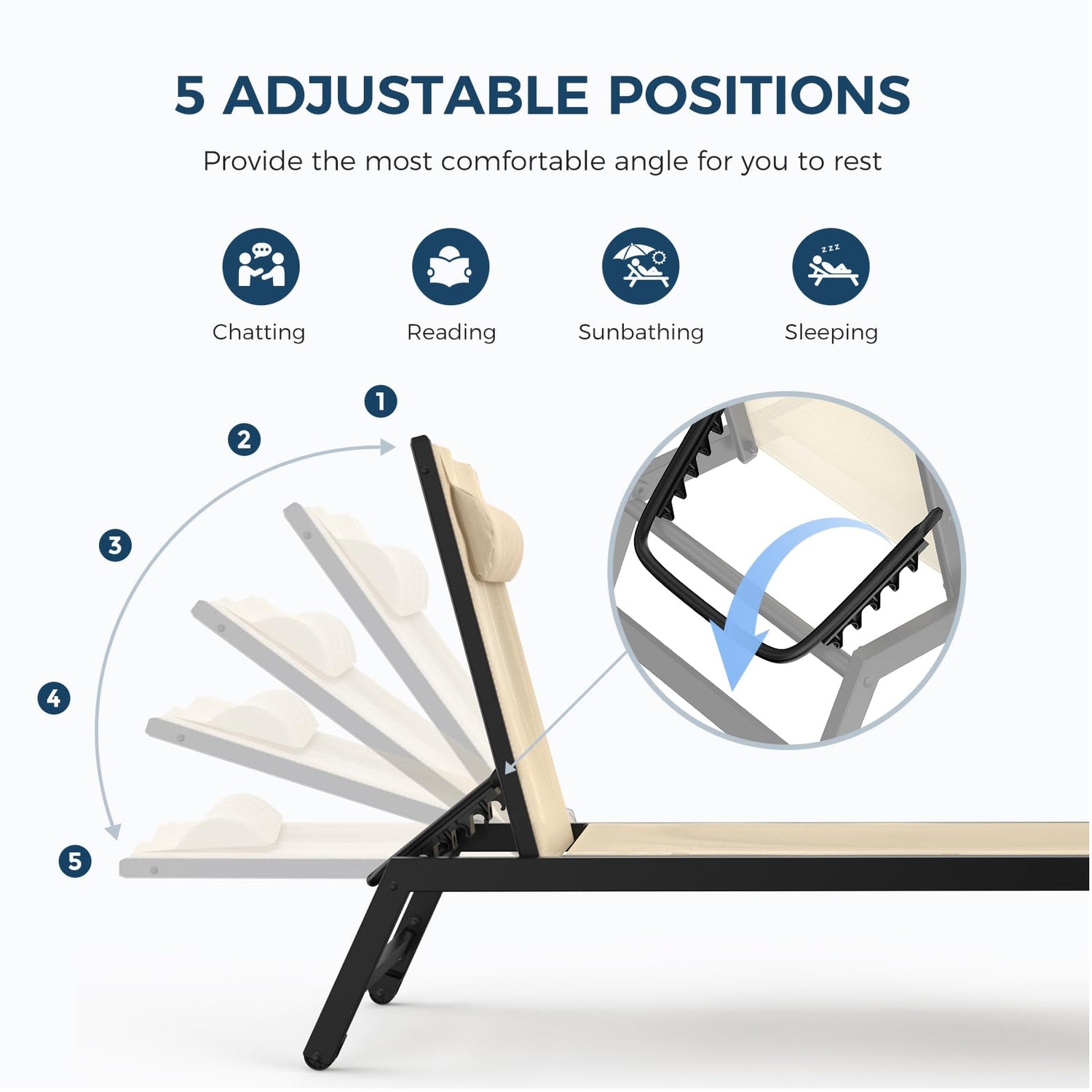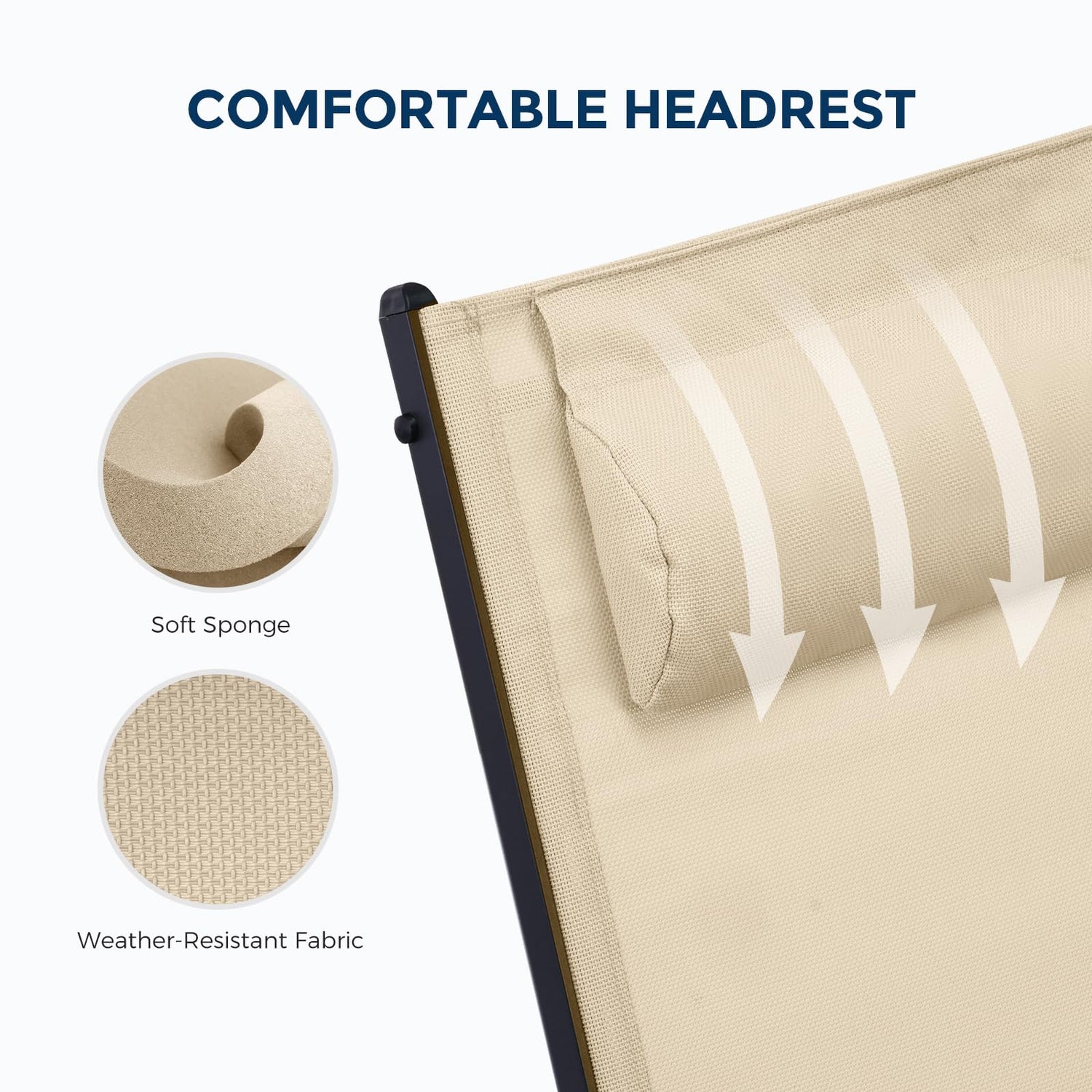 HOMSHADE Outdoor Aluminum Lounge Chair -Set of 2 with 5 Position Adjustable Backrest, Textilene Fabric, Two Wheels, Headrest for Pool, Beach, Beige (No Table)