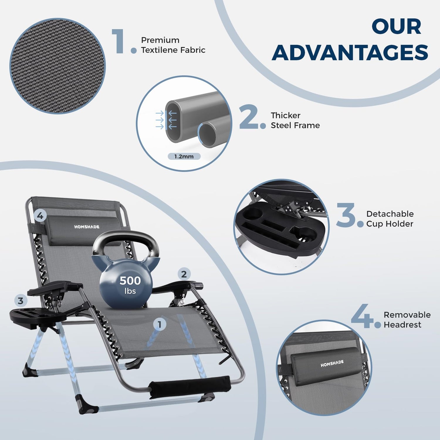 - Upgraded 33IN Large Size: The zero gravity recliner measures 33"W x 30"D x 45"H and the recliner weighs 27.5 lbs. Upgraded Zero Gravity Chair can hold up to 500 lbs. Thickened steel tubing is more stable for improved weight capacity and durability.