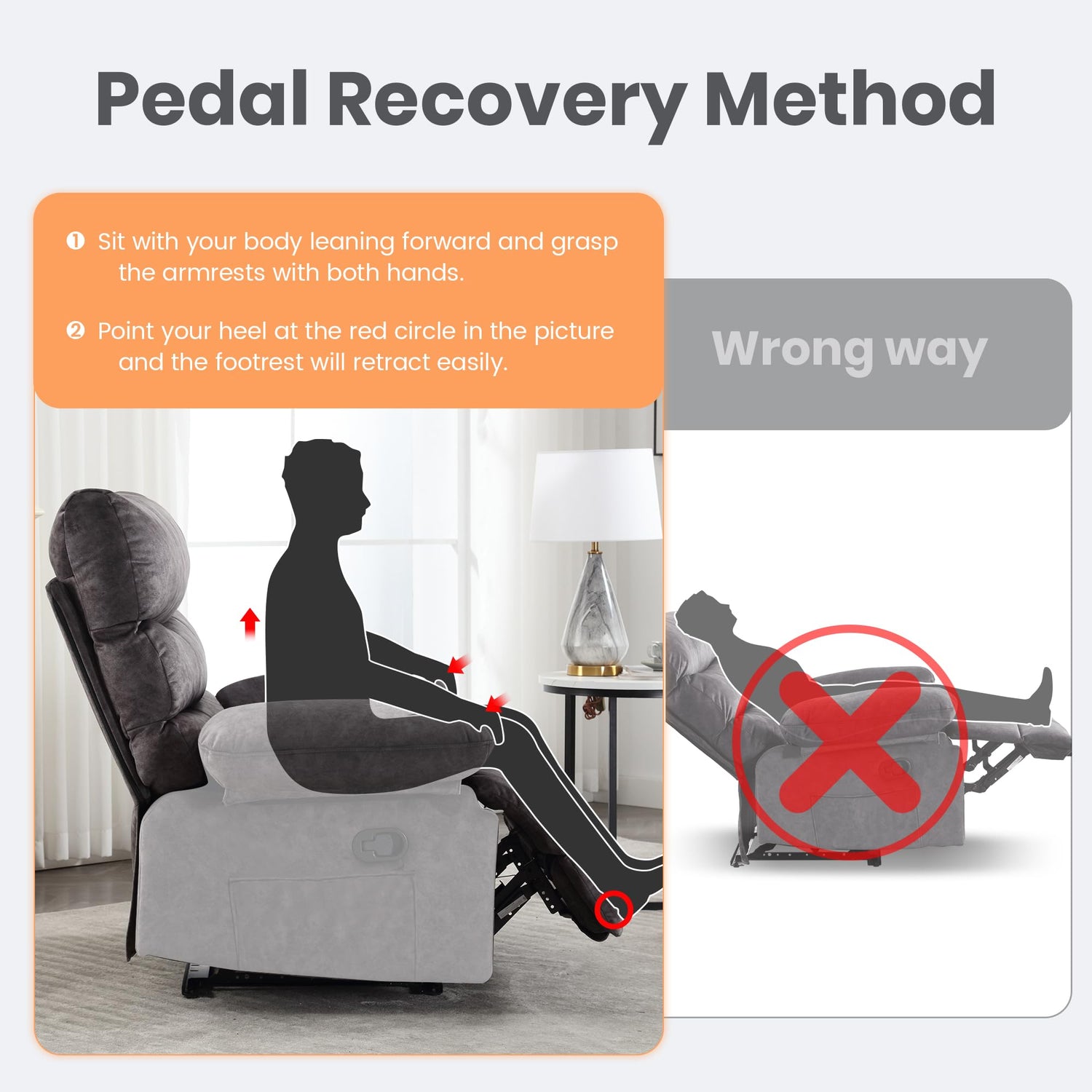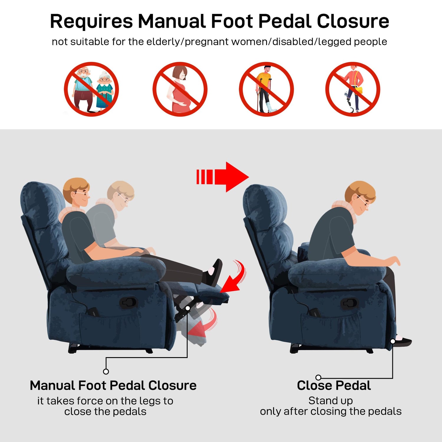 - RECLINING - The footrest of this recliner is not electrically unfolded but unfolded by the side pull ring, closing the footrest will encounter some resistance, so it is not suitable for the elderly/pregnant women/disabled/legged people.