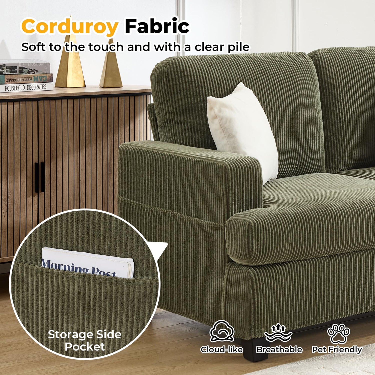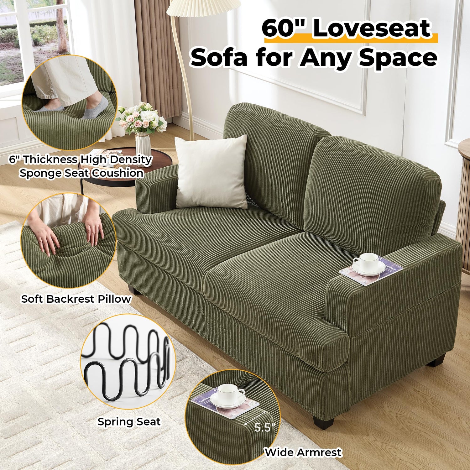 HOMYKA Loveseat Sofa, 60" Corduroy Couch with Side Pocket, Removable Pillow and Cushion Cover 2 seat Couches, Comfy Modern Small Couch for Living Room, Small Spaces, Dorms, Office, Green