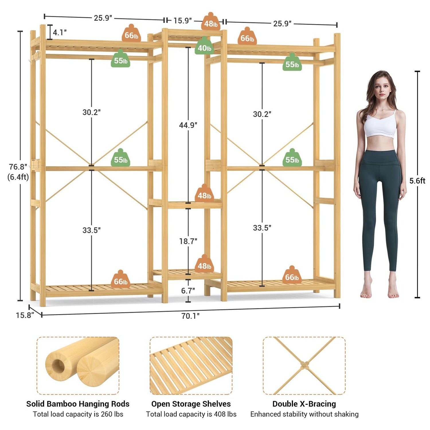 - Stable Clothes Rack With 2 Support X-Bracing - Dimensions: 70.1”W x 15.8”D x 76.8”H with a total load capacity of 668 lbs. The frame and shelves are made of non-deformable thick bamboo wood, ensuring the sturdiness and durability of this freestanding closet. Equipped with 2 metal X-bracing on the back for added stability and load-bearing capacity.