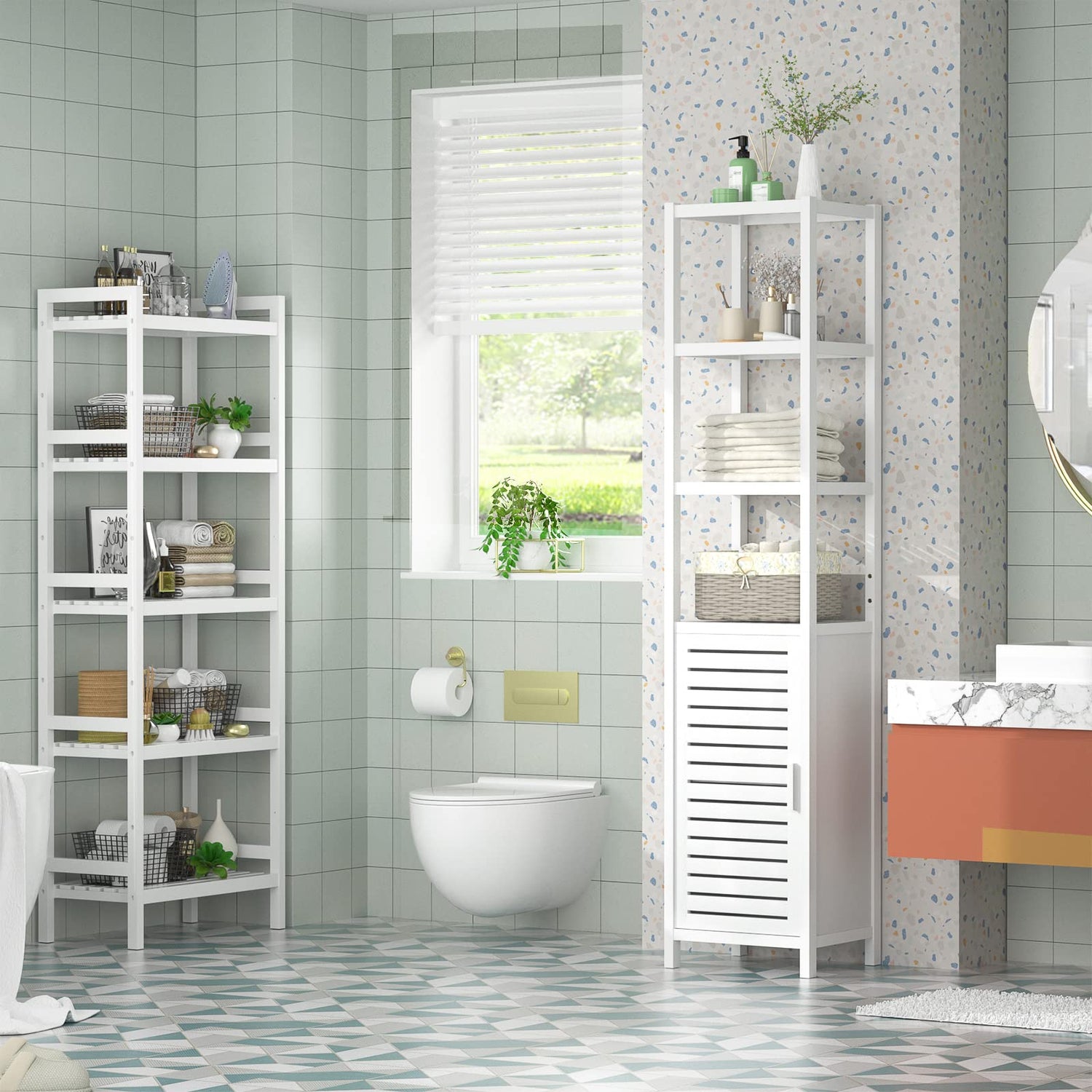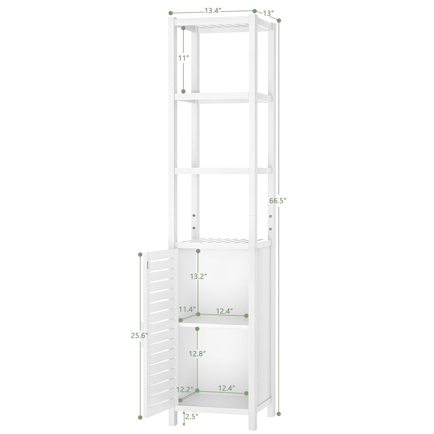 - NATURAL BAMBOO STORAGE CABINET - White slim cabinet is made of sustainable bamboo for clean green living, the shutter door and slatted shelves add style and charm to this storage cabinet. You can easily hide the spare toiletries, toilet paper, and hairdryer behind the door, display your favorite diffuser, atmosphere candles, and plush towels on the shelves.