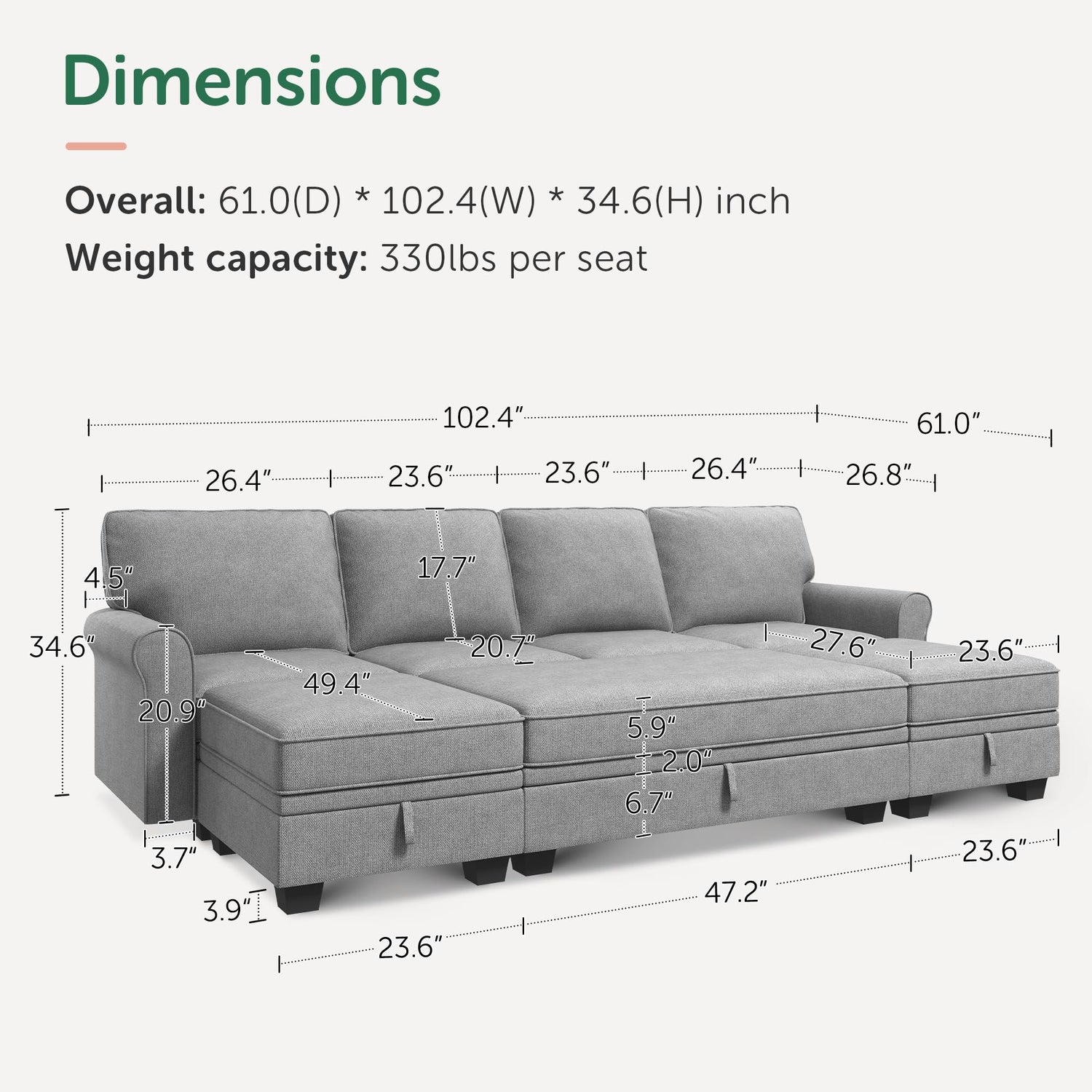 - Large storage space: The 4 seat section is made up of 2 double seat with storage space and all ottomans have storage space. These storage space can meet your storage needs for large items. You just need to pull the strap and lift the cushion lid to easily open it