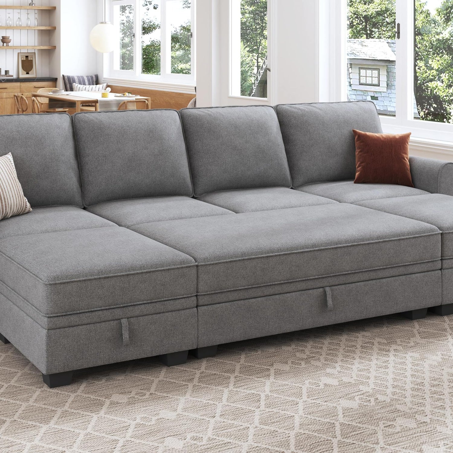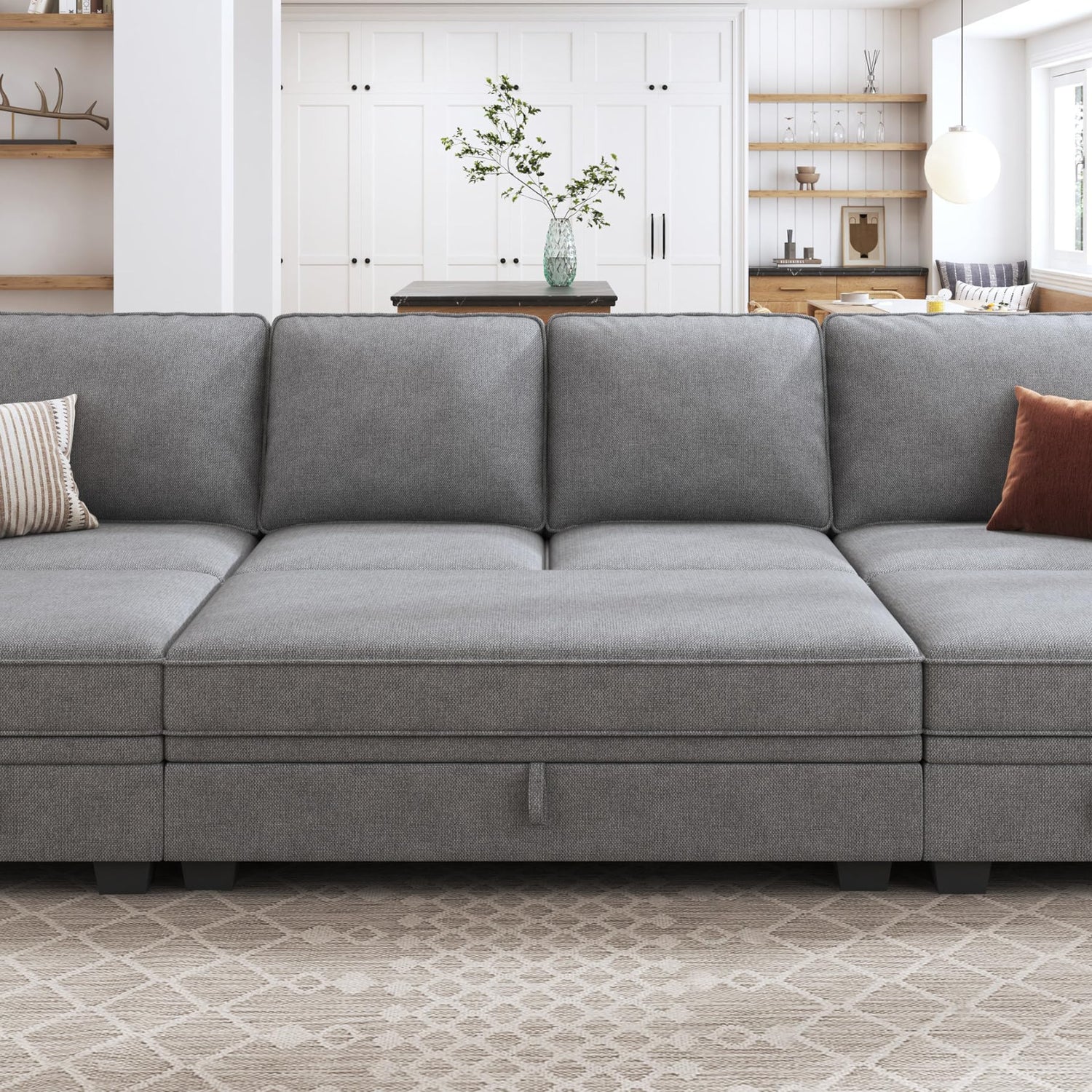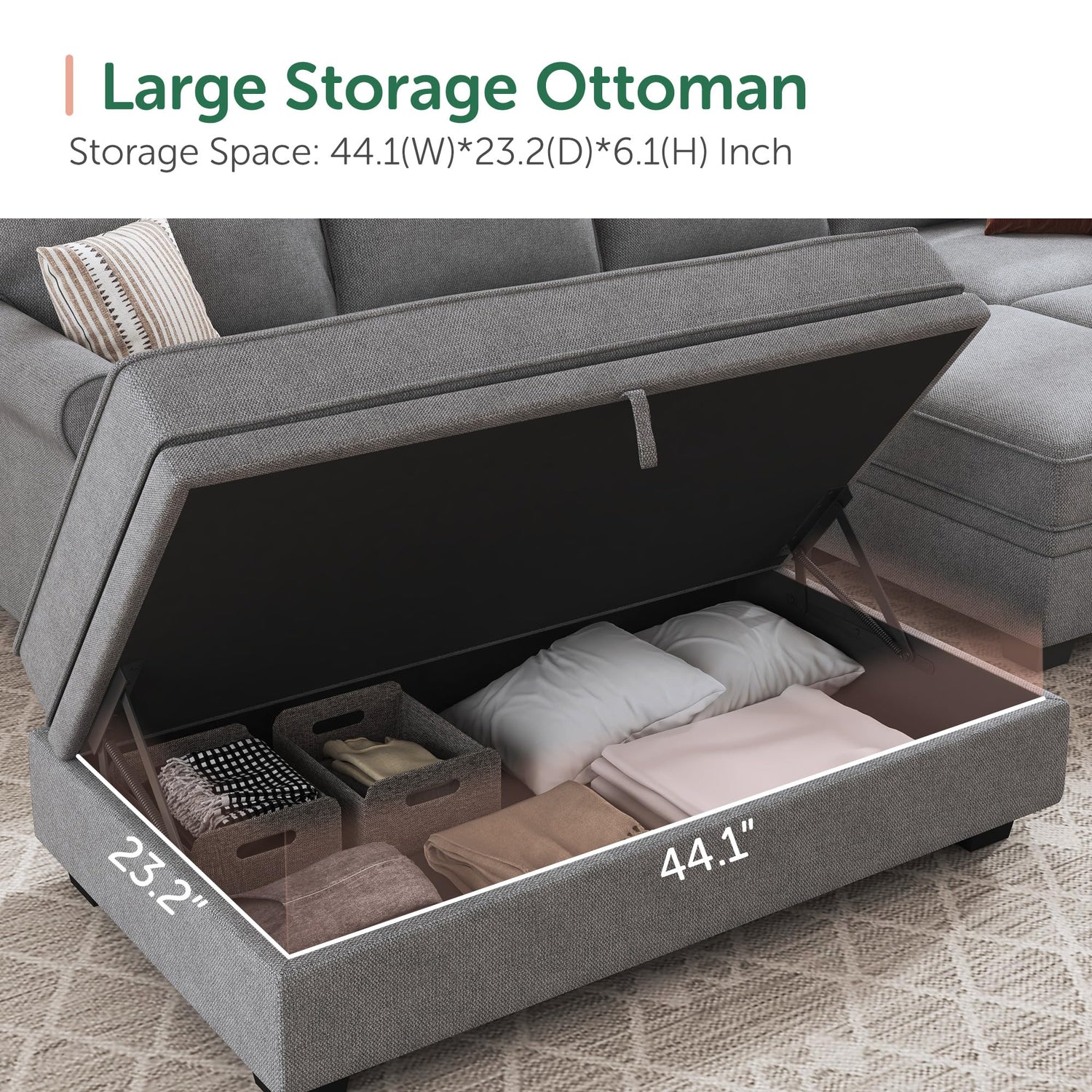 HONBAY Convertible Sectional Sofa Set with Storage Seat U Shaped Sectional Couch with Reversible Chaise Sleeper Sectional Couch Bed for Living Room, Light Grey