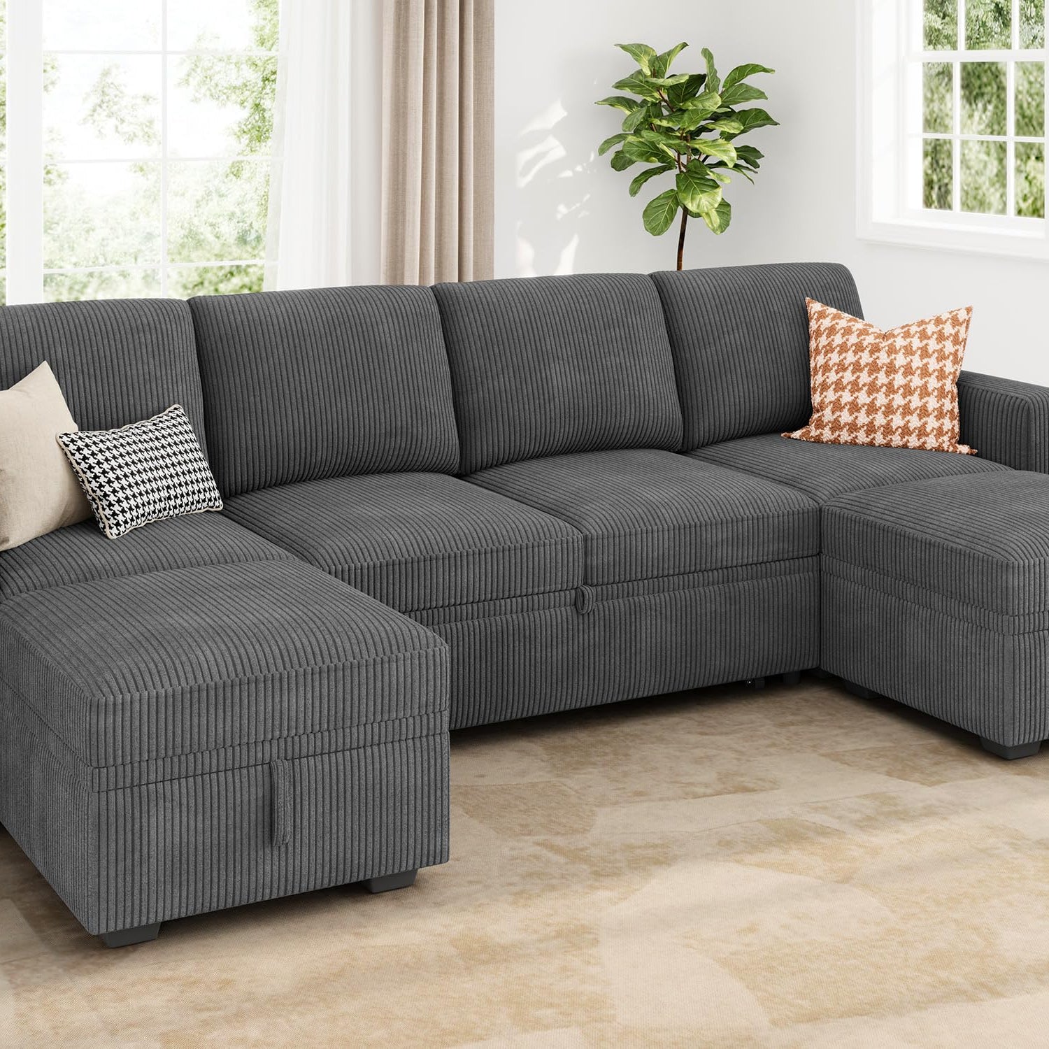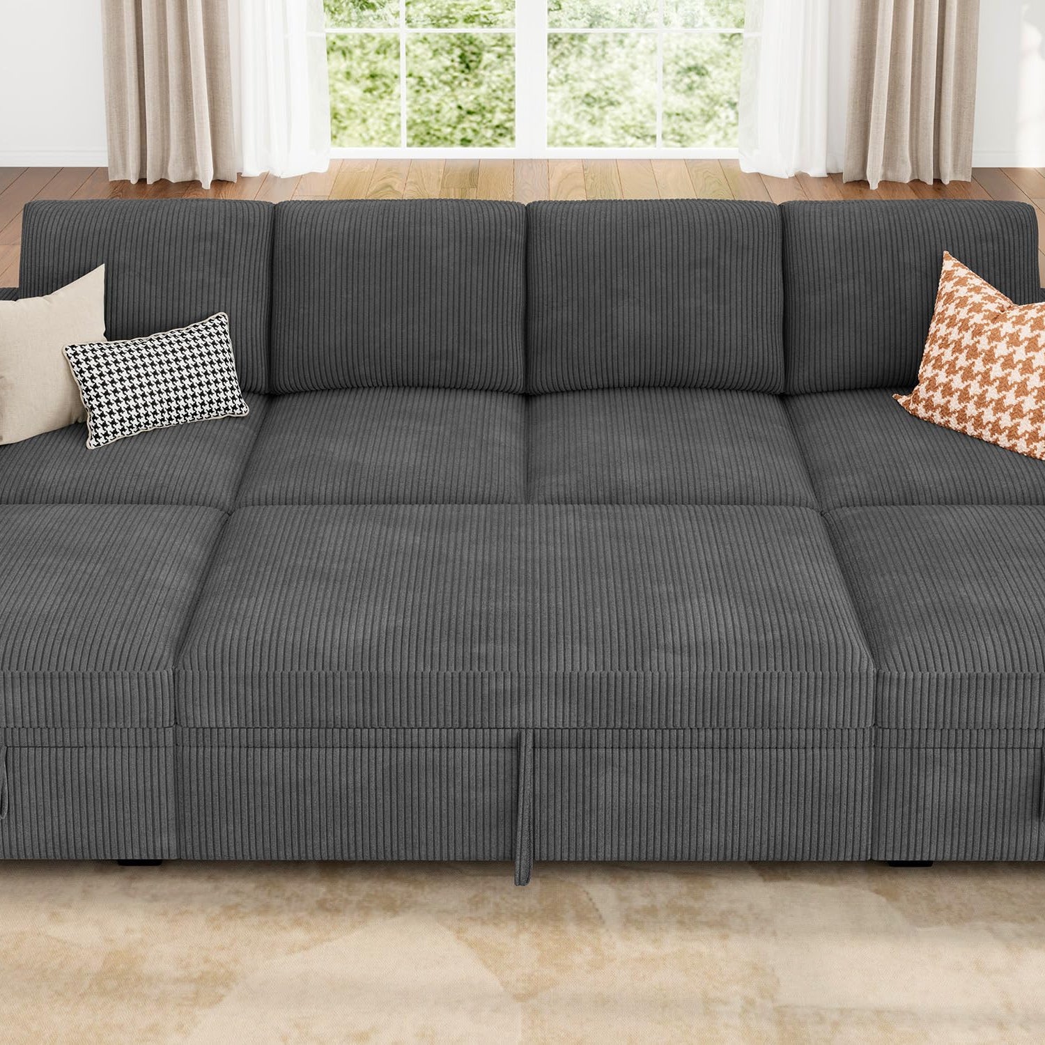 HONBAY Modular Sectional Sleeper Sofa Bed, Corduroy Pull Out Couch with Storage Ottoman, U Shaped Sectional Couches for Living Room, Dark Grey