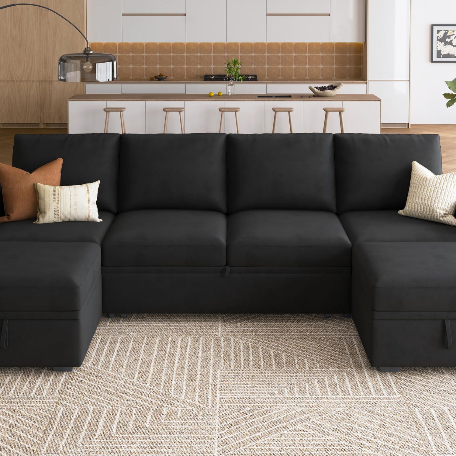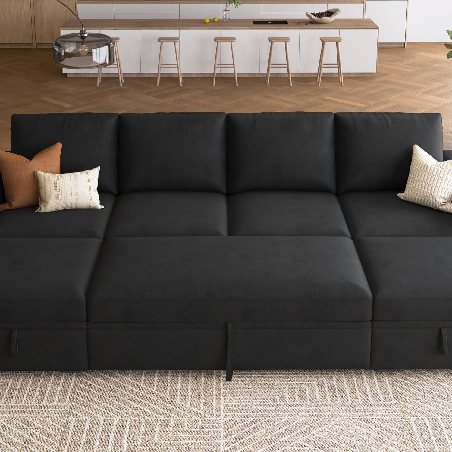 HONBAY Modular Sectional Sleeper Sofa Bed, Velvet Sectional Couch with Pullout Bed U Shaped Modular Couch with Storage Ottoman for Living Room, Black