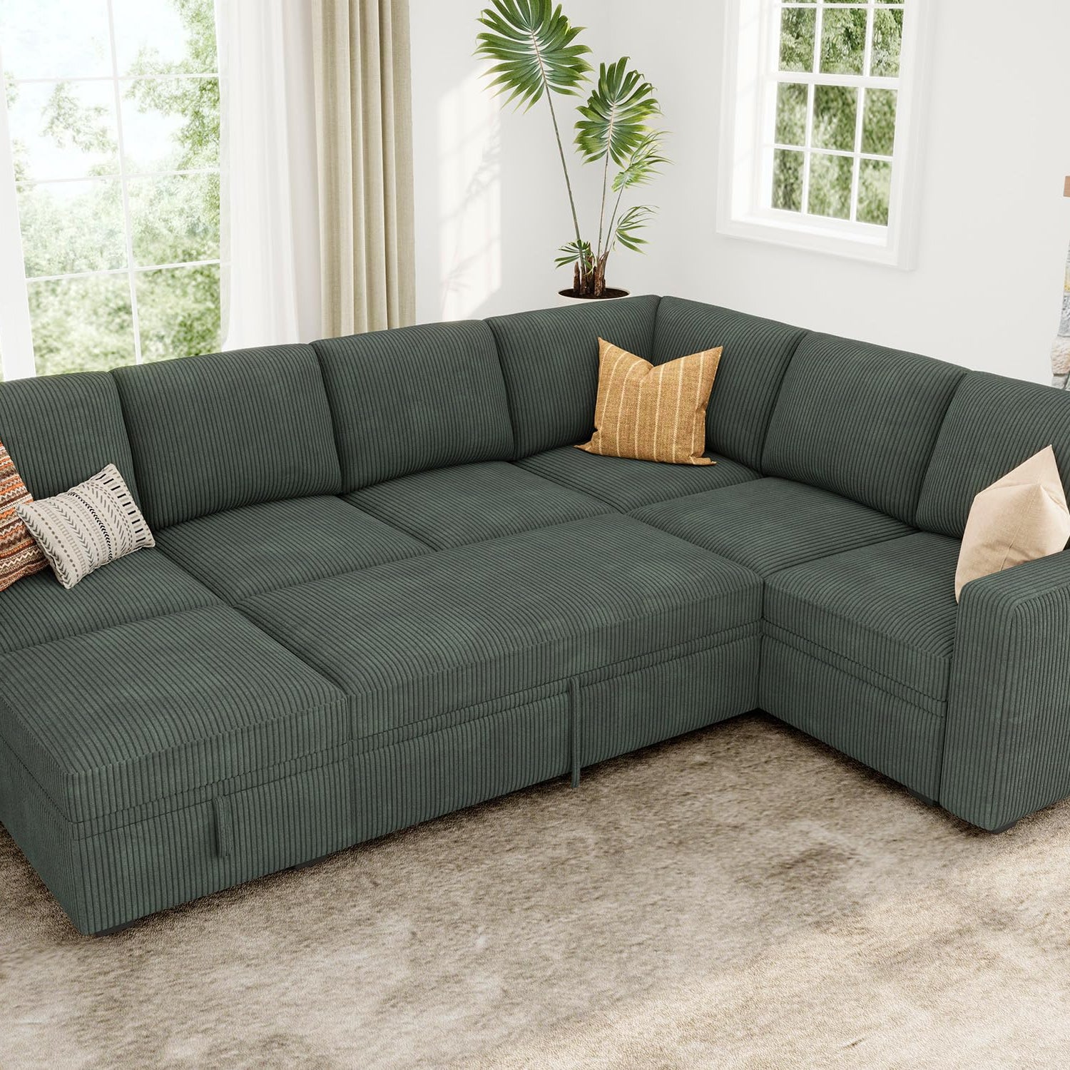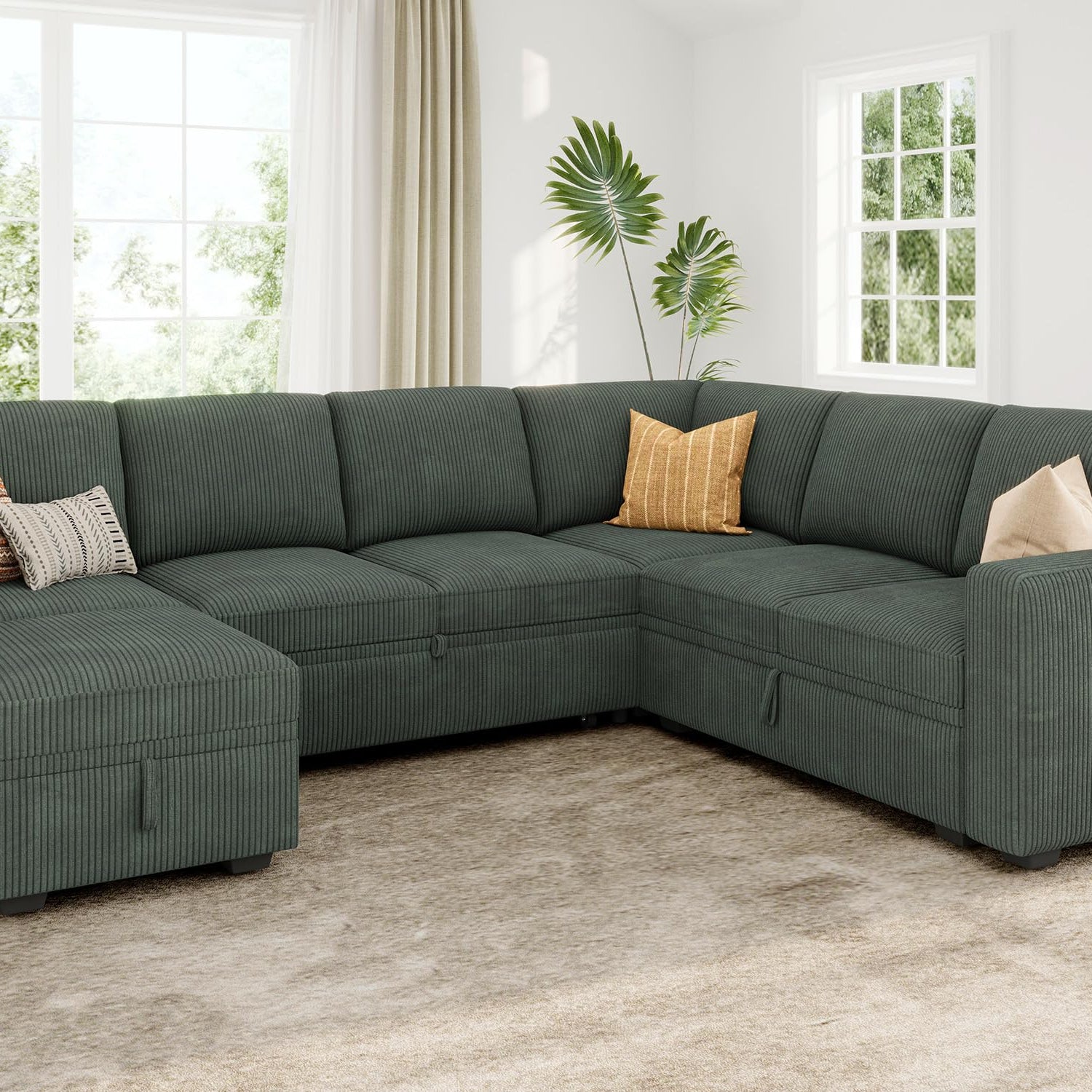 HONBAY Modular Sectional Sleeper Sofa with Pull Out Bed, Corduroy Couch with Storage Seats Ottoman, U Shaped Sectional Couches for Living Room, Green