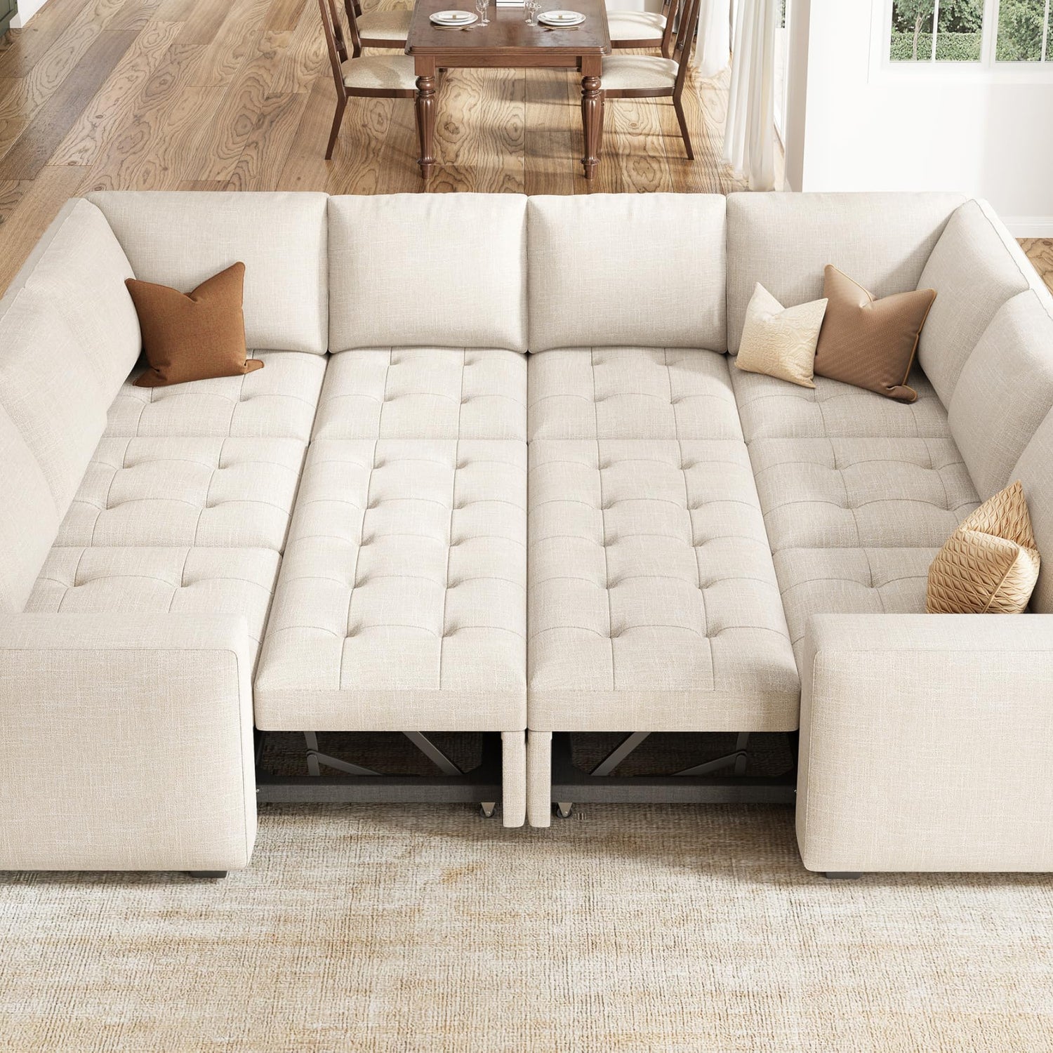 HONBAY Modular Sectional Sleeper Sofa with Pull Out Bed, Linen Convertible U Shaped Sectional Couch with Storage Seat, Sectional Couches for Living Room, Beige