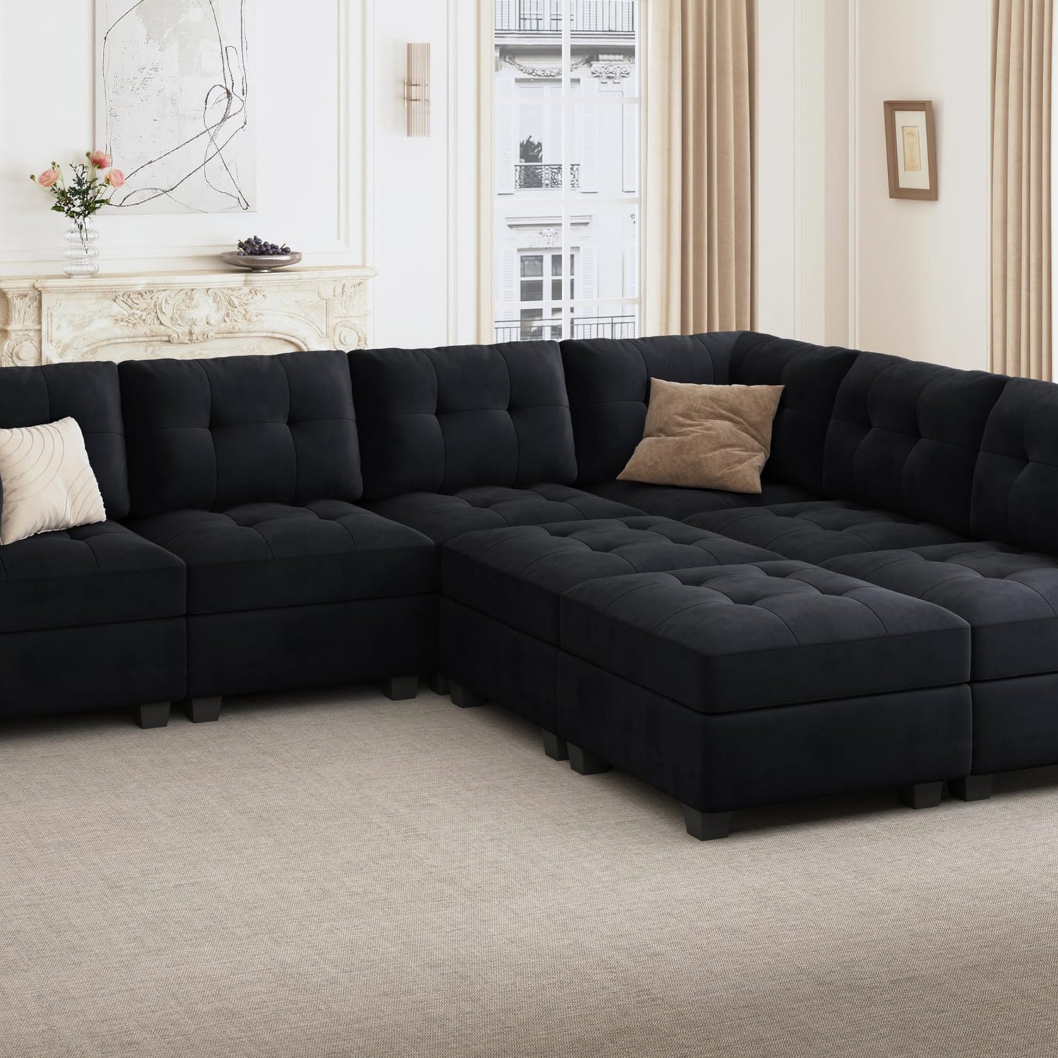 HONBAY Modular Sectional Sleeper Sofa with Storage, Velvet Modular Sofa Couch Oversized, 8-Seat Reversible Velvet Sleeper Sectional Sofa Bed for Living Room, Black