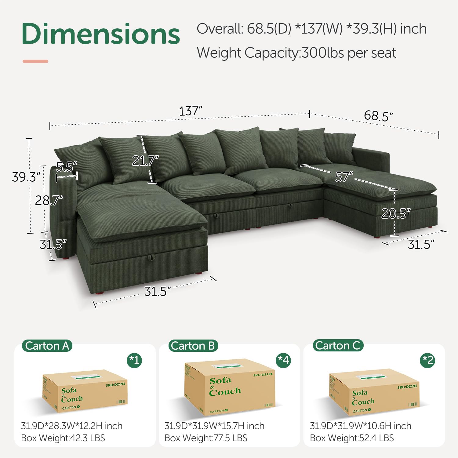 - Couch size: The overall size of the couch is 137''×68.5''×28.7'', capacity is 300 lbs per seat