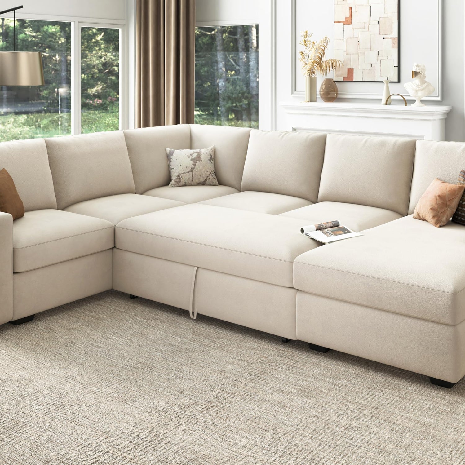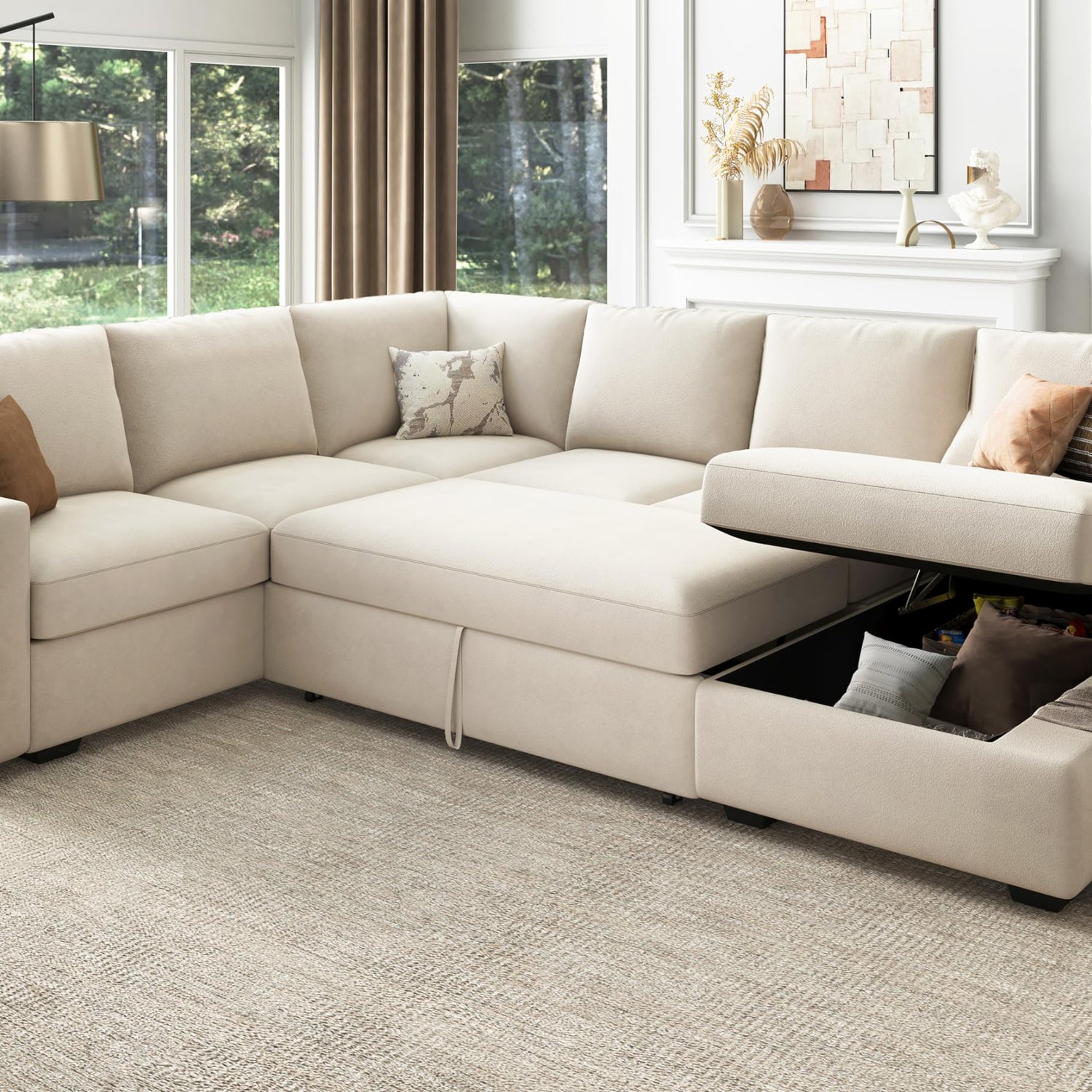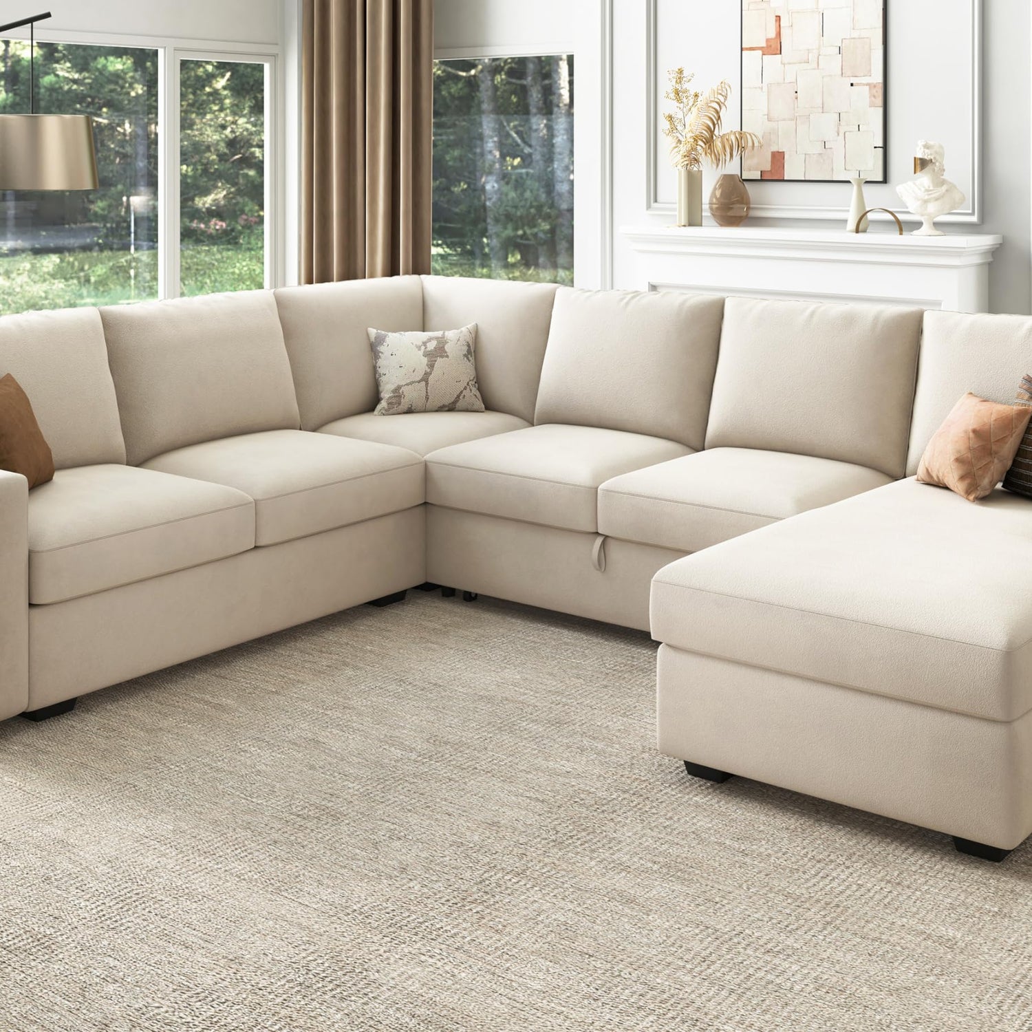 HONBAY Sectional Couch with Pull Out Bed, Sectional Sleeper Sofa with Storage, U Shape Sectional Couches for Living Room,Velvet Beige