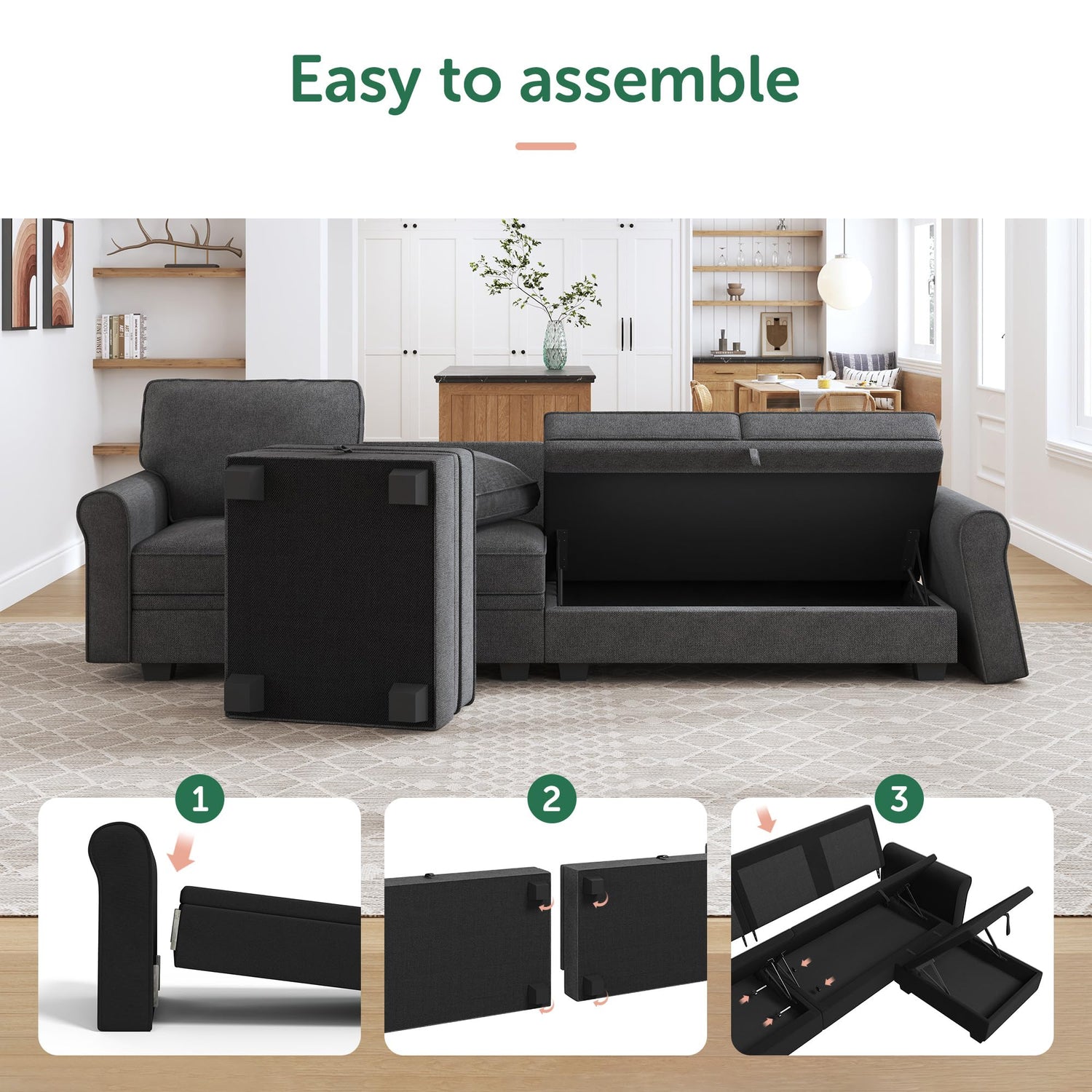 - Hidden Storage Space: The storage space under each seat of the sectional sofa can not only store children's toys, but also store blankets and remote controls, making the room look neat and clean