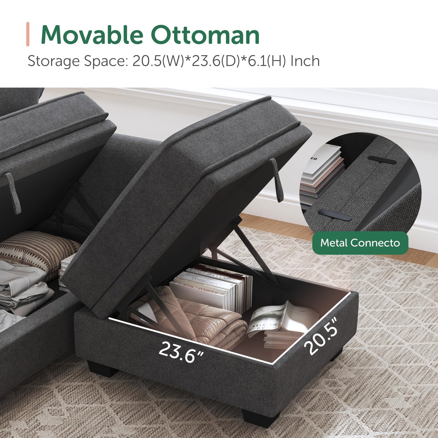 - Movable Ottoman: The sectional couch is composed of a 4 seat sofa and 2 movable ottoman. Ottomans can be connected to the 4 seat sofa by connecting pieces to form a U shaped sofa. Ottomans can also be placed individually according to your needs