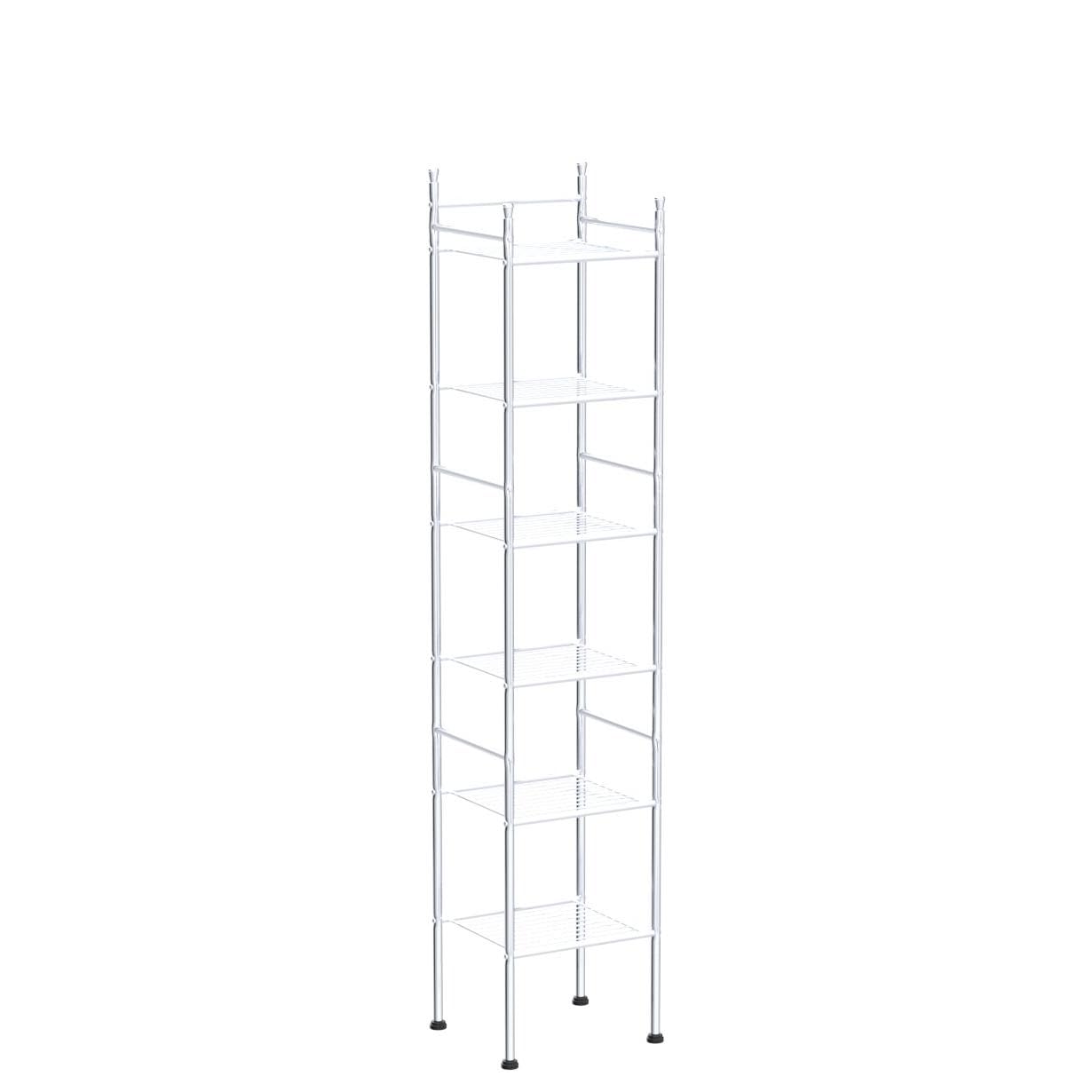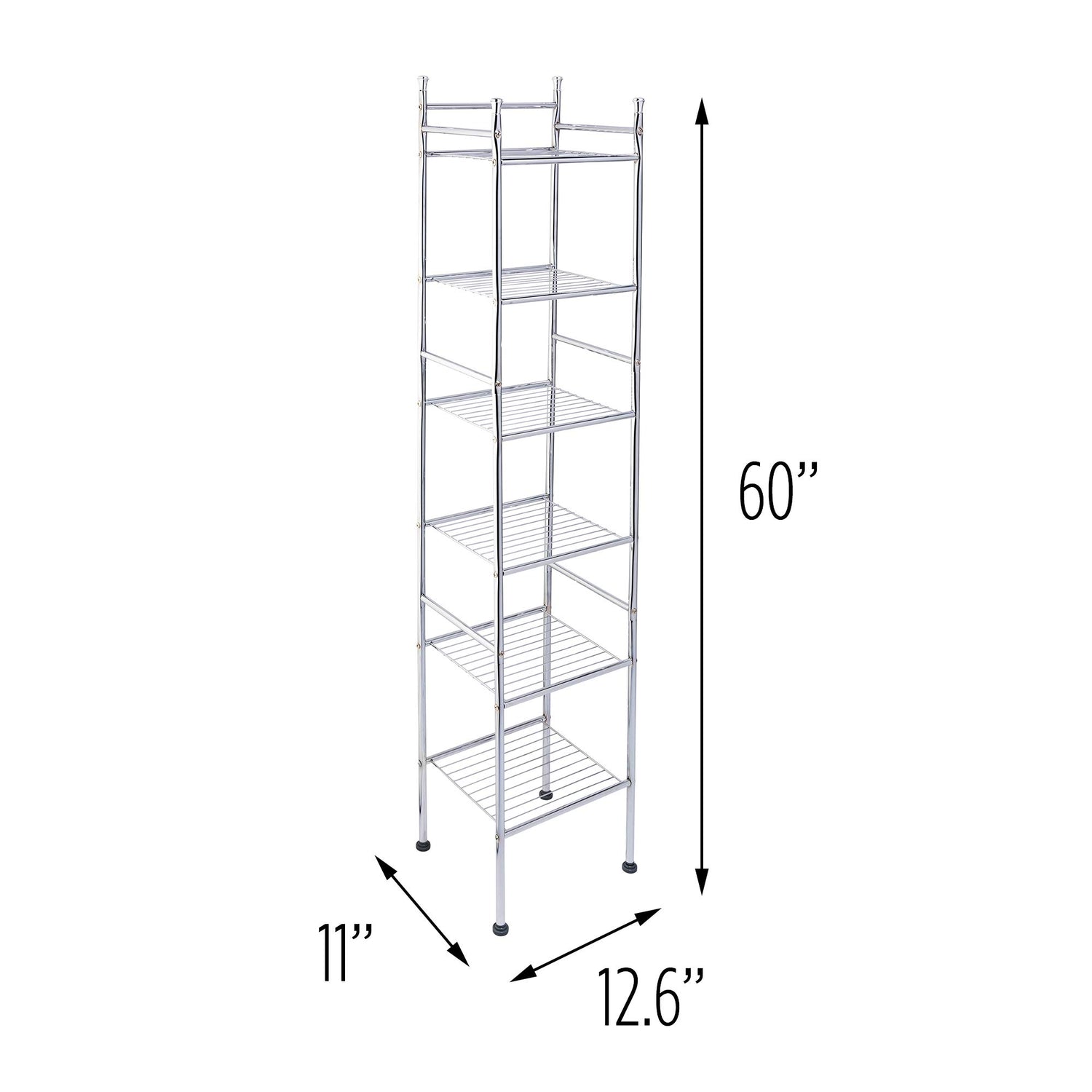 Details: Honey-Can-Do bth-03484 6 tier metal tower bathroom shelf, chrome, 12.6”L x 11”W x 59.8”H. Ideal for towels and toiletries. Reduces clutter and creates extra storage space. Shelving feet will not scratch/scuff floors. Brilliant chrome finish. Measures: 12.6”L x 11”W x 59.8”H