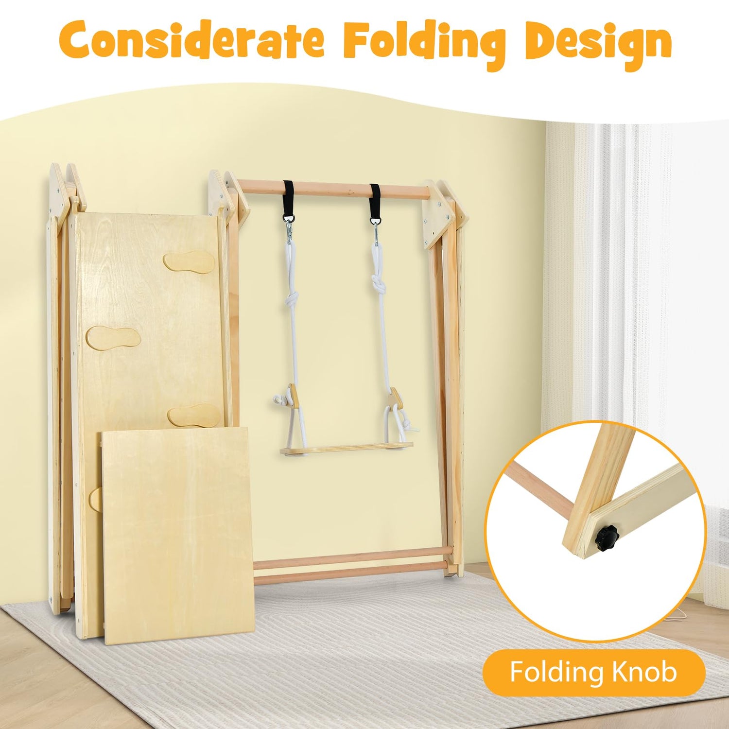 - 【Sturdy & Foldable Gym Construction】Featuring a reinforced triangular structure, combined with 30mm thick climbing bars, this toddler indoor playground provides a solid foundation for swinging, climbing and sliding and can hold up to 275 lbs. Furthermore, the convenient foldable base allows for easy storage when not in use, perfect for smaller play areas.