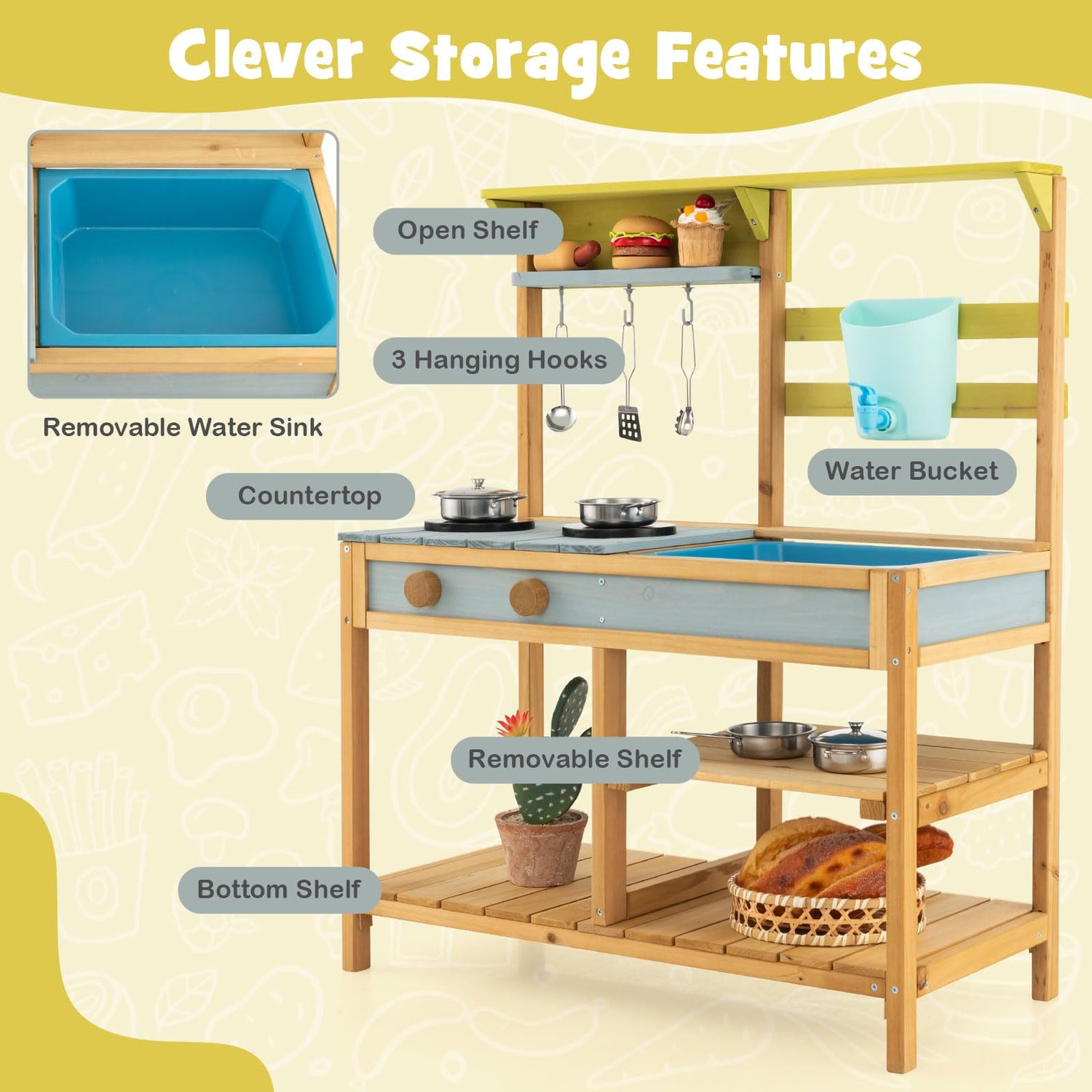Description: Introducing our delightful wooden mud kitchen, a world of endless possibilities for imaginative play! Crafted with love, this kitchen is not only safe and durable, but also provides a thrilling experience for kids. You can rest easy knowing that our non-toxic and odor-free material keeps your little ones safe. Plus, the little chef can have a blast with this realistic play kitchen - turn on the running water faucet, wash ingredients in the sink and turn on the stove. With clever storage features, including 3 hanging hooks, a spacious countertop, a removable shelf and wide bottom shelf, this kitchen set is the epitome of realism. Furthermore, it encourages social ability, creative thinking and hands-on coordination, being the ideal gift for budding chefs to embark on their muddy culinary adventures. Features: Equipped with water bucket, faucet and removable water sink Open shelf storage options for kids cooking toys Removable shelf brings customized storage space Burners with twist n’ click knobs for a realistic experience Solid fir wood material ensures a long-lasting performance in the outside Well-crafted burr-free surface to protect kids’ tender hands Give you peace of mind with ASTM and CPSIA certifications Great gift choice for kids above 3 years old Specification: Material: Fir Wood + PP + ABS Overall Size: 29.5” x 14” x 36” (L x W x H) Size of the Removable Shelf: 15” x 14”(L x W) Countertop Height: 20” Suitable Age: 3 + Net Weight: 13 lbs Note: Toy Accessories NOT Included Package includes: 1 x Wooden Kid’s Play Kitchen 1 x Instruction