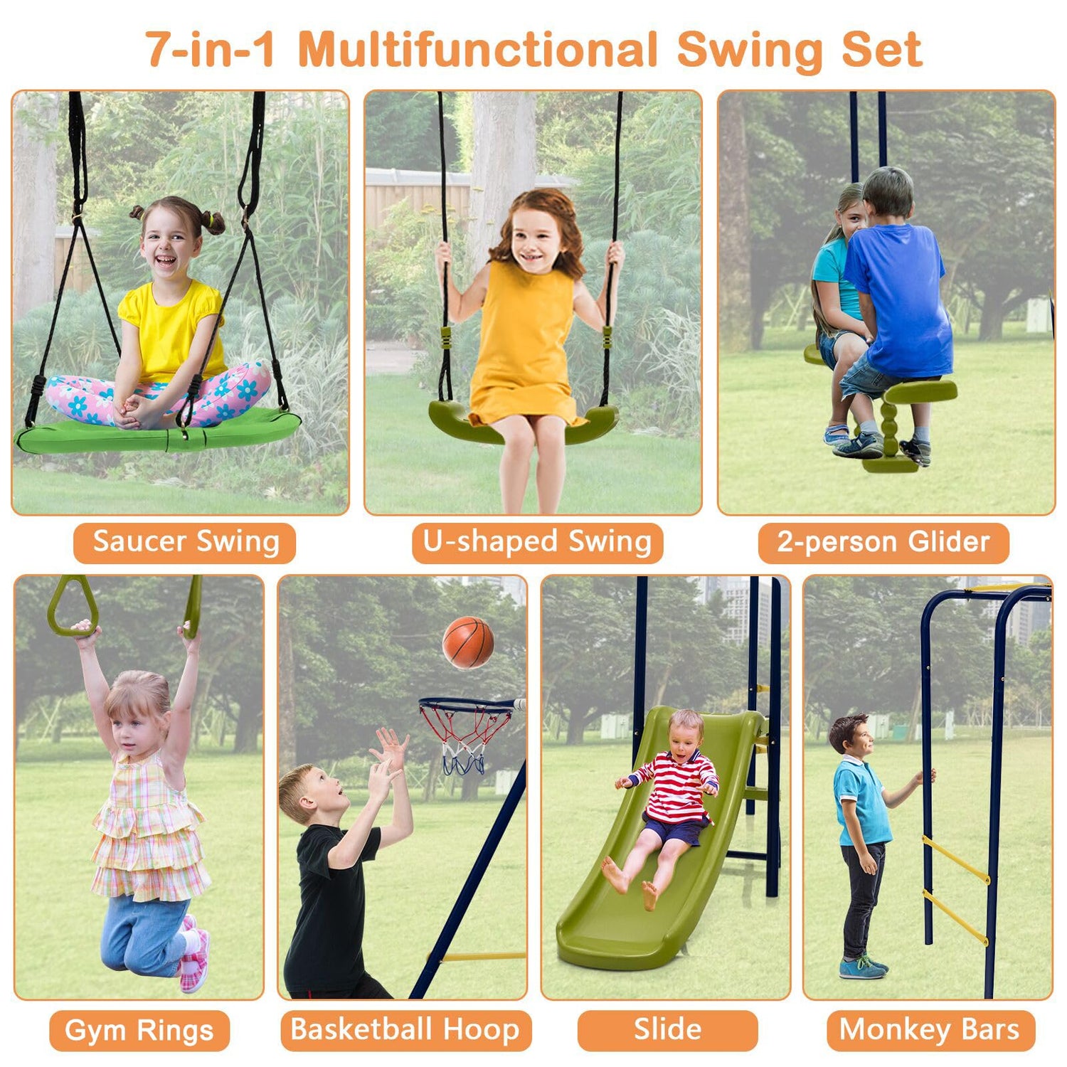 - 🥏🥏【7-in-1 Swing Sets for Backyard】This versatile swing set includes a U-shaped swing, a saucer swing, a 2-person glider, a slide, 2 gym rings, a monkey bar, and a basketball hoop, allowing up to 7 kids to freely choose their favorite activity. The maximum weight capacity for the entire swing set is 660 lbs, with each seat capable of supporting up to 110 lbs.