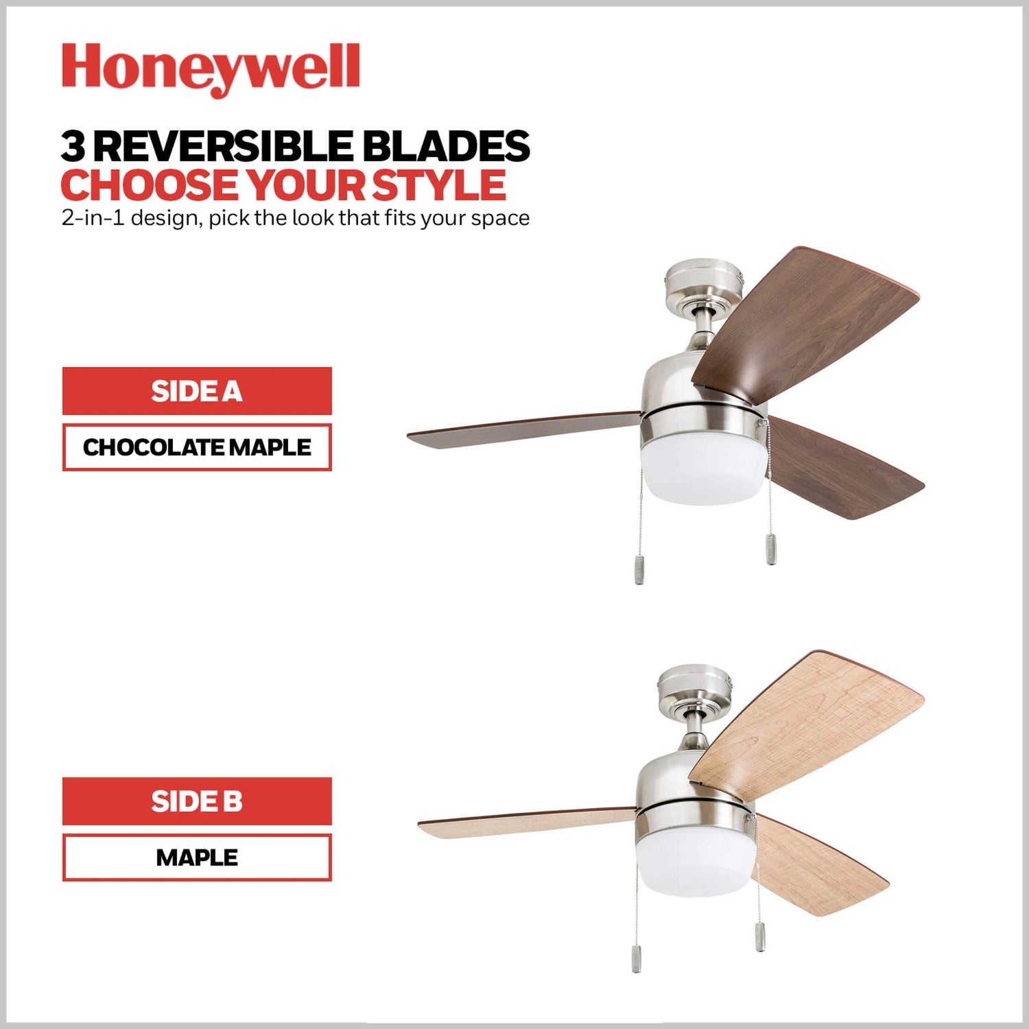 Details: The Barcadero dry rated modern ceiling fan with light combines stylish details with contemporary influences for true decor inspiration. This small ceiling fan with light features beautifully frosted glass and dimmable LED lighting, along with an innovative 3-blade design that provides efficient, adjustable airflow. Control your Honeywell fan with two pull chains, 1 for the fan’s 3 speeds and one to turn the light kit on and off. This pull chain light fixture and fan is also compatible with universal ceiling fan remotes (sold separately). Enjoy year-round comfort by adjusting the reversible airflow to change the direction of the modern ceiling fan with light. During summer, this modern fan will provide a cooling effect, and throughout winter, our strong fan can reverse to spread warm air, helping reduce energy costs. This high-powered fan blends with many decor styles. When paired with your decor, it can be transformed into a mid-century modern ceiling fan, farmhouse ceiling fan, or the industrial ceiling fan with light you've been looking for. The LED ceiling fan light provides 1400 lumens and a 2700k color temperature. Whether you're looking for a small bedroom ceiling fan with light, office fan, or other small room fan, this reversible wood ceiling fan with light has you covered.