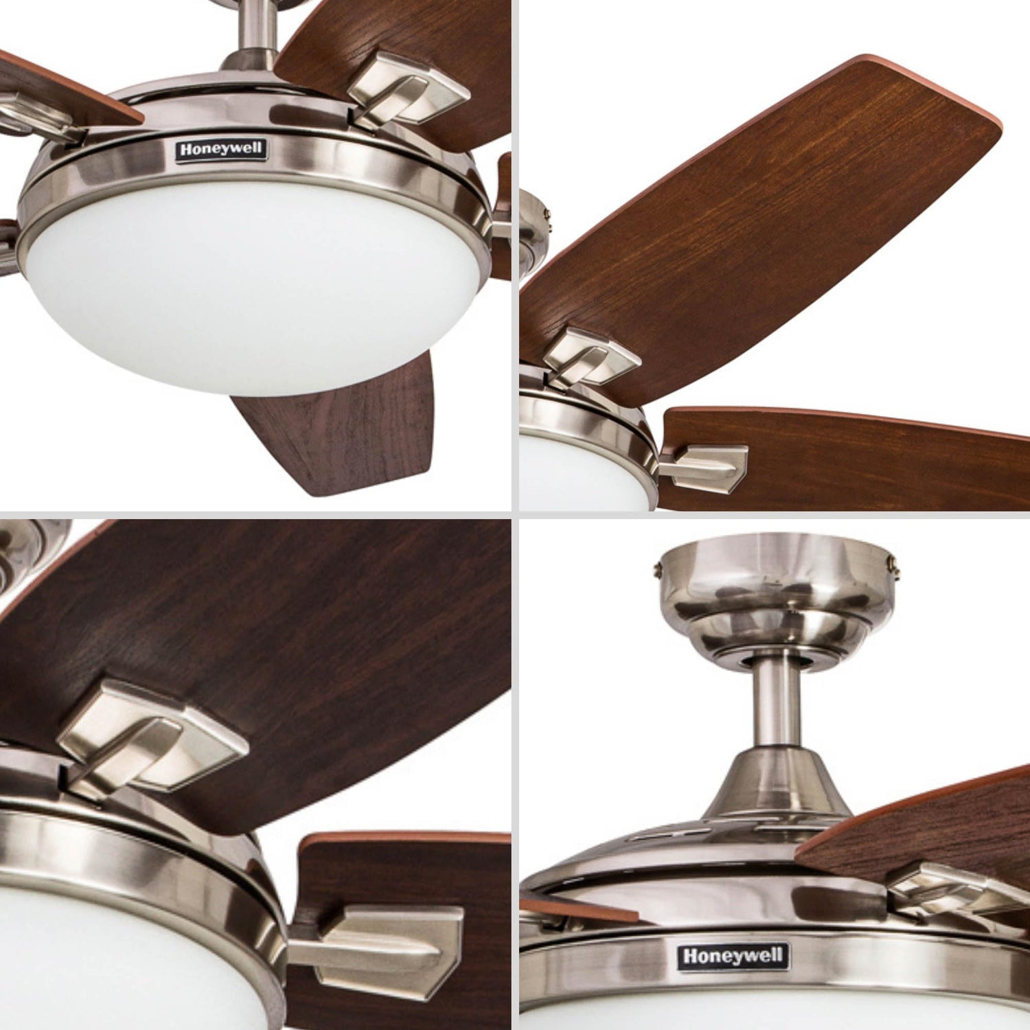 Details: Honeywell ceiling fans make your home comfortable in summer (and winter) as well as help to reduce energy costs. Enjoy the welcome breeze in any room of your home while looking stylish. This modern multi-position indoor ceiling fan combines stylish details with contemporary influences for a truly inspiring fixture for your home. The Carmel features a lightly frosted domed glass shade with LED lighting. The innovative 5-blade design provides ultra-efficient, adjustable and energy efficient airflow while the LED lights provide ideal lighting for the area. Control your Honeywell ceiling fan with a touch of a button with our easy-to-use ceiling fan remote control with wall mount option (batteries included). Enjoy year-round comfort by adjusting the reversible airflow switch that easily allows you to change the direction of the fan to properly distribute air. During hot summer months it will provide a cooling effect or when reversed, spreading warm air in the winter to help reduce energy costs. Specifications: Sizing: 48 inch 5-blade indoor fan for rooms up to 400 sq. ft. Lighting: 2 x E26 / A15 light bulbs included that provide 800 lumen, uses 8.5 watts, 3000K color temperature, dimmable 20% to 100%. About Honeywell Ceiling Fans Honeywell Ceiling Fans features a collection of fans in various sizes and specifications to ensure your choice of indoor or outdoor fan delivers optimum performance for your room's size. You can trust the quality of Honeywell Ceiling Fans to deliver maximum airflow and a stylish lighting option. Honeywell Ceiling Fans use high-quality materials that are long lasting and durable with satisfaction guaranteed by manufacturer limited lifetime warranty.