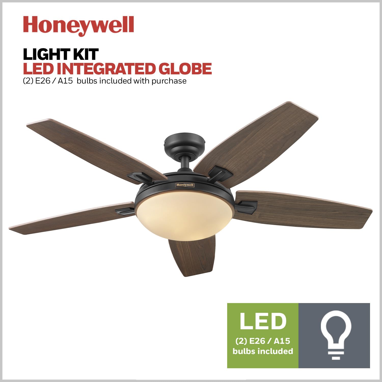 Details: The Carmel dry rated modern ceiling fan with light and remote combines stylish details with contemporary influences for true decor inspiration. This large ceiling fan with light features lightly frosted dimmable LED lighting, along with an innovative 5-blade design that provides ultra-efficient, adjustable airflow. Control your Honeywell fan with our easy-to-use ceiling fan remote control that's packed with features like Walk Away Light Delay and Homeshield. Enjoy year-round comfort by adjusting the reversible airflow to change the direction of the modern ceiling fan with light. During summer, this ceiling fan with remote will provide a cooling effect, and throughout winter, our strong fan can reverse to spread warm air, helping reduce energy costs. This high-powered fan blends with many decor styles. When paired with your decor, it can be transformed into a mid-century modern ceiling fan, farmhouse ceiling fan, or the industrial ceiling fan with light you've been looking for. The LED ceiling fan lights provide 1600 lumens and 3000k color temperature. Whether you're looking for a large bedroom fan, living room ceiling fan, or family room fan, this reversible wood ceiling fan with light has you covered.