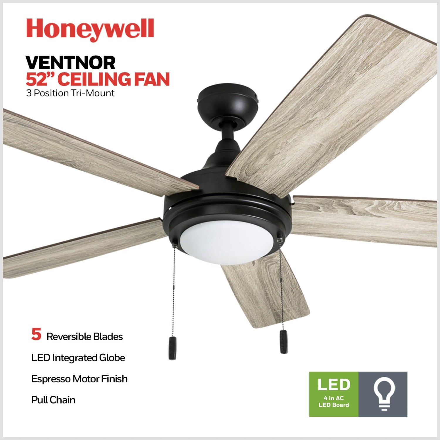 Details: The Honeywell Ventnor is a 52-inch ceiling fan that is perfect for your indoor space. Bringing a more contemporary approach to the traditional ceiling fan, this transitional model pairs exceptionally well with many styles. The integrated lighting offers a very fluid look, while the LED board inside brings plenty of light with 1400 lumens. The frosted white glass paired with the espresso bronze finish and ancient pine blades gives this fan a very rich and wholesome allure. The Honeywell Ventnor ceiling fan is sure to liven up any area and leave your space in awe.