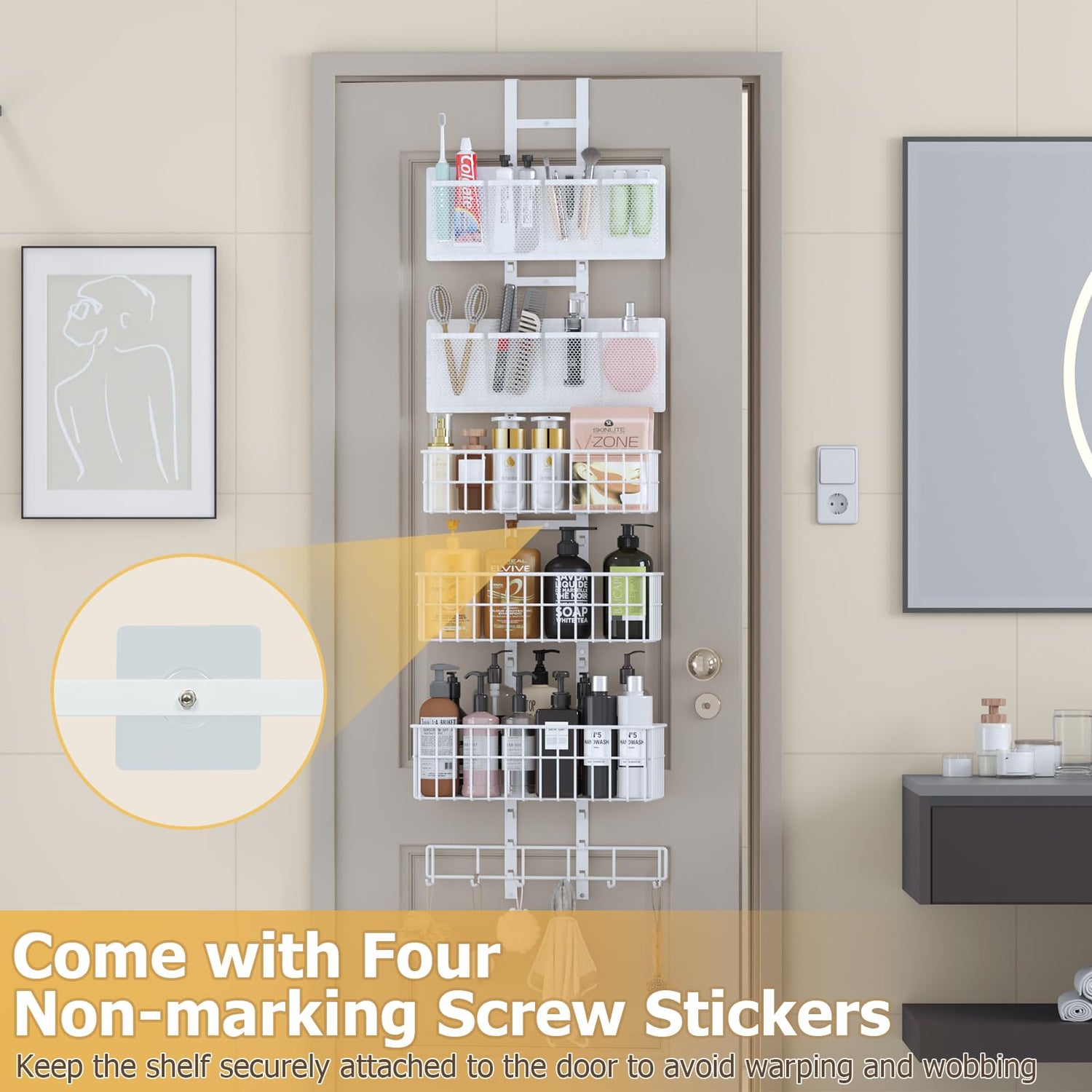 - [Height Adjustable]The 6 tier over door bathroom organizer comes with metal baskets, fabric organizers, and hooks that all hang onto the rack. The height between each tier is adjustable, so you can space the baskets however you need to fit items of different sizes. It makes storing and grabbing your stuff super easy. Oh, and you can also hang the hooks on the very top if you want!