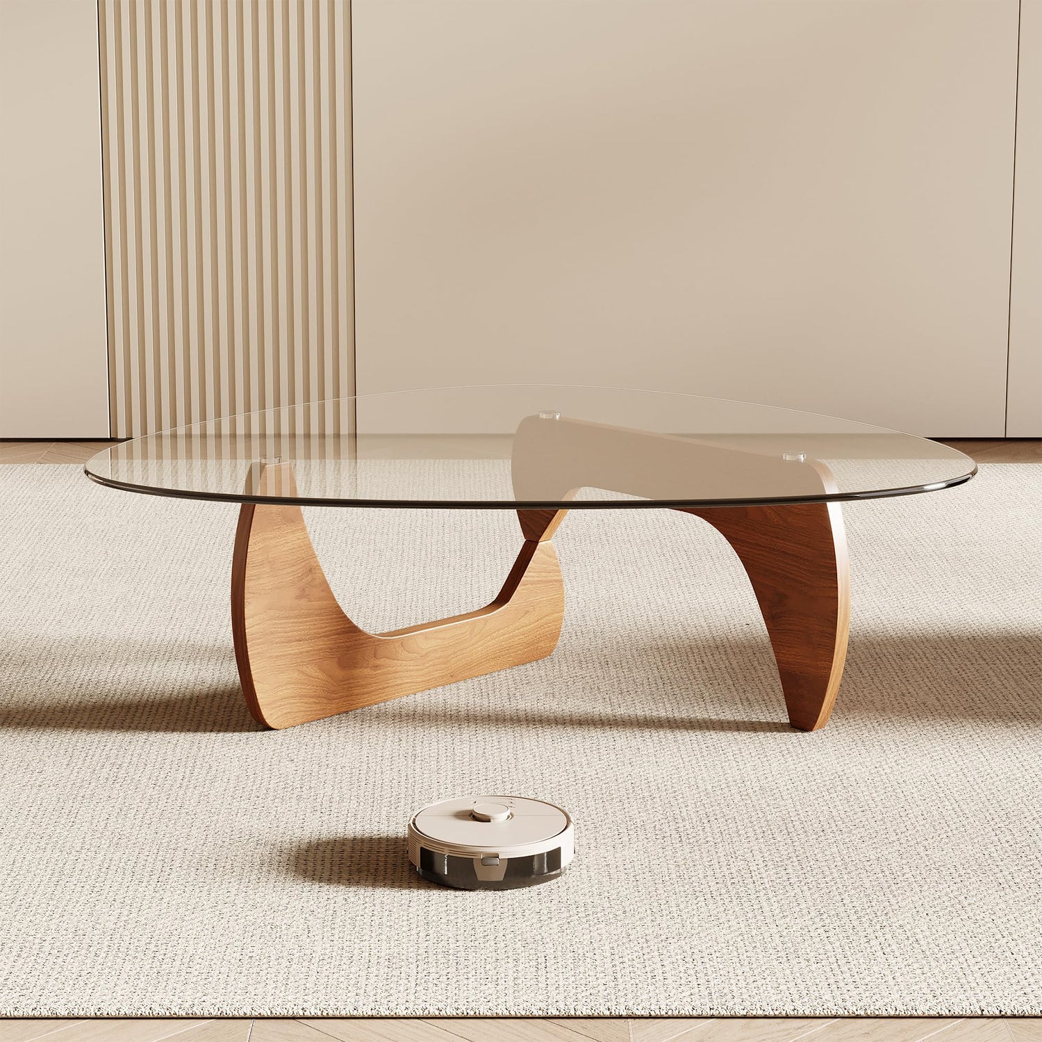Honyee Morden Coffee Table, Tempered Glass Top Coffee Table with Wooden Legs, 42.5" x 28.5" x 16.1" Triangle Coffee Table for Living Room, Natural Wood