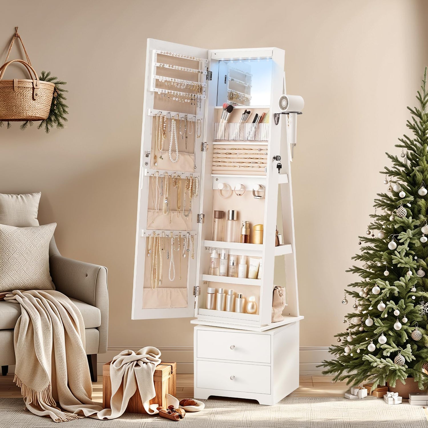 - 4-in-1 Rotating Jewelry Cabinet: The 360° swivel jewelry cabinet with LED lights combines a full-length mirror, ample jewelry storage, 2 handy wooden drawers, and 3 open display shelves into one unit, maximizing space and meeting your diverse lifestyle needs with style and ease