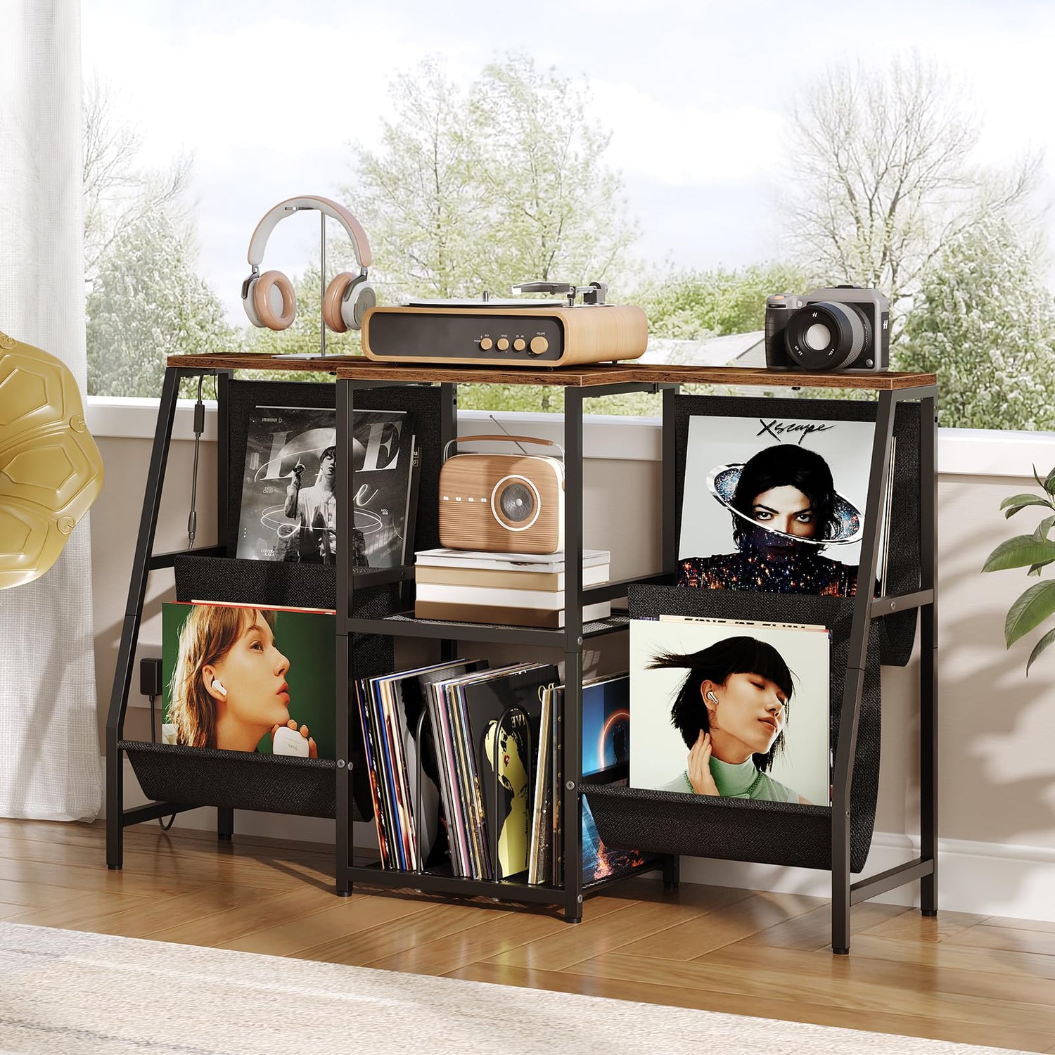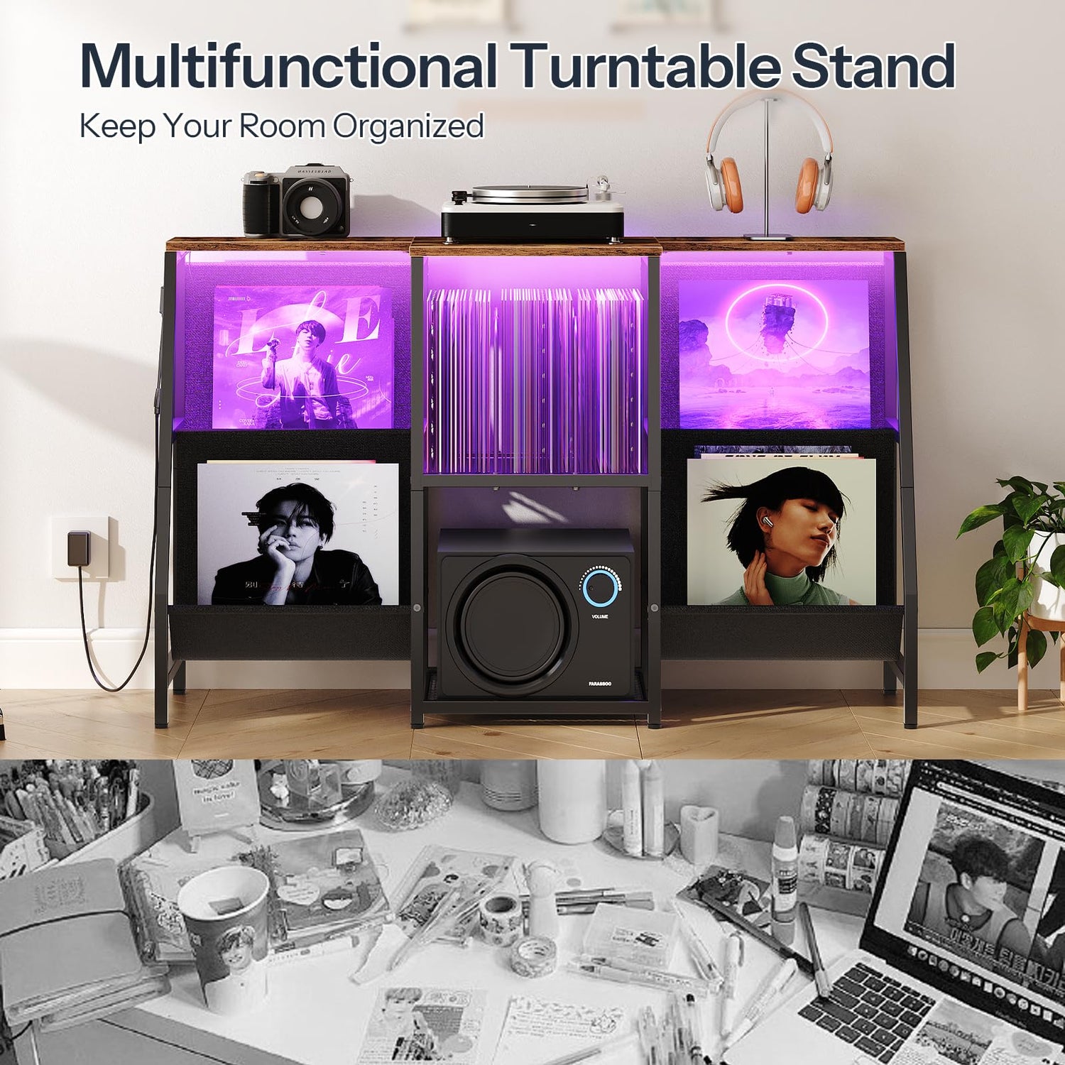 - Ambient LED Light Strip: An adjustable LED strip enables this media stand to create a customizable ambiance. Two stylish record display storage racks have totally 4-tier vinyl shelf storage spaces. The whole record stand can hold over 200 records